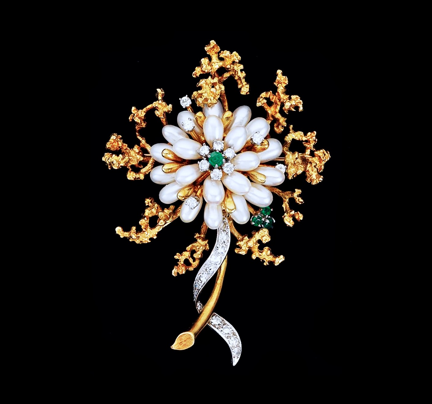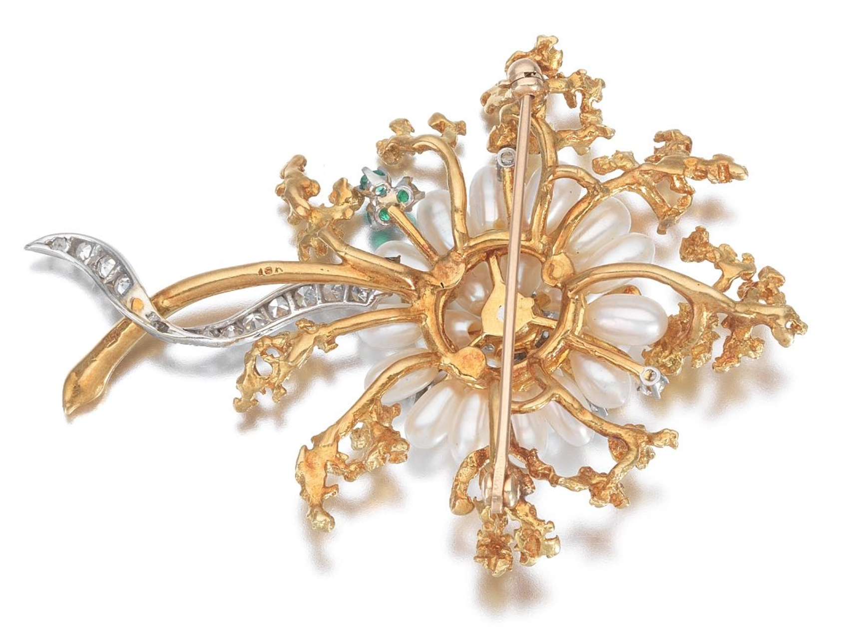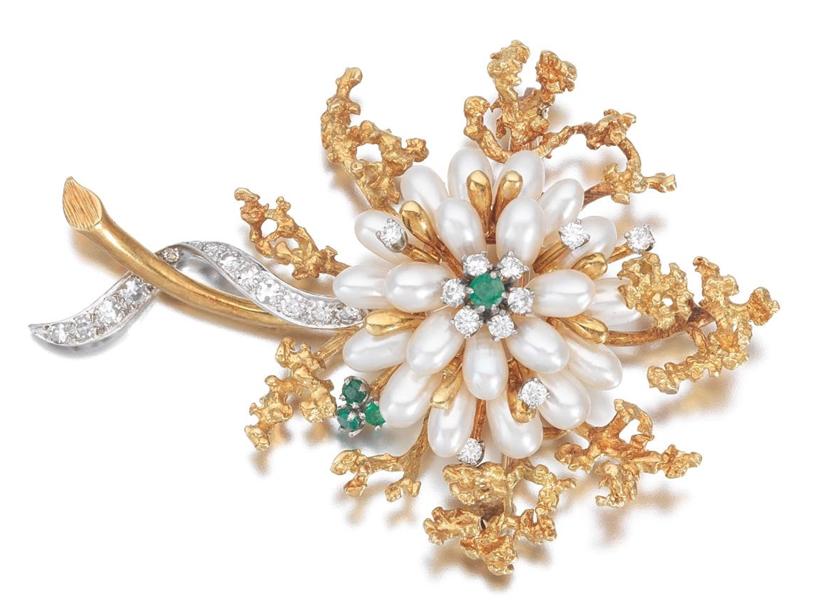 Title: Gold Pearls Emeralds Diamonds Jewelry Art Pendant Brooch