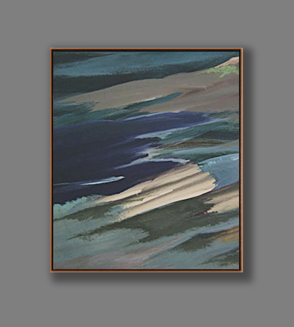 Oregon Edge, Evening by artist Howard Rackliffe, American, 1917-1987. Abstract seascape painting by renowned American abstract landscape artist, Howard Rackliffe. Striking, gestural rhythms make this a powerful piece. Signed, titled work with the date of completion noted was inspired by and dedicated to a friend moving from New England to the West Coast. Piece was exhibited at a retrospective of the artist's work in Connecticut. The acrylic on board painting is mounted under glass and attractively framed in contemporary brushed chrome. If desired, statement of provenance in private collection and past appraisal can be provided. Howard Rackliffe’s paintings are infused with passion and a gestural immediacy. Landscape elements are reduced to strong, basic forms that are constructed with a bold directness. Rackliffe’s painting style shares the same response to nature and its organic impulses, as represented in the tradition of landscape painting established by such American artists as Marsden Hartley, Arthur Dove and John Marin. His works have been featured in one-person exhibitions at the Todd Gallery, NY; the New Britain Museum of American Art, CT; and the Caldbeck Gallery, ME., and in group exhibitions at the Virginia Museum, Richmond, VA; Jacques Seligmann Gallery, NY; and the Ringling Museum, Sarasota, FL. He was one of eight artists featured in the “8 From Connecticut” exhibition at the Wadsworth Atheneum in 1960 which also included Cleve Gray and Bernard Chaet. His work was the focus of a retrospective exhibition in 1990 at the New Britain Museum of American Art, CT. which traveled to the Farnsworth Museum, Rockland, ME. Rackliffe’s works are represented in the collections of the Barnes Foundation, Merion, PA; Columbia University, NY; New Britain Museum of American Art, CT; Portland Museum of Art, ME; the Provincetown Art Association and Museum, MA and the Farnsworth Museum, ME.