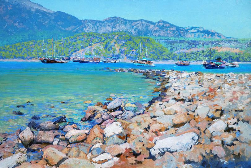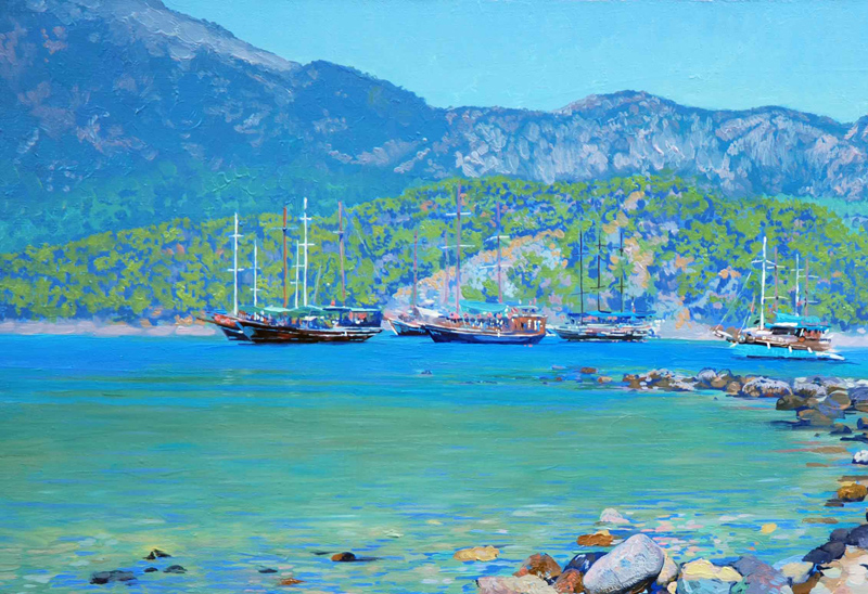 Sunny's Harbor by artist Simon Kozhin: Committed to the Russian realistic school, graduate of the Russian Academy of Painting, Sculpture and Architecture, he aspires for absolute fidelity in reproducing the reality. The artist’s range of interests is wide: historical picture, still life, landscape, illustration. Unusual is his approach to solution of each new canvas, no formulas, nothing typical. Some canvases appeal at once – by the consummate craft, fullness of colour and light, and feel. Others require focused attention, contemplation, rational approach. The painter works a lot with landscapes. His series of Moscow views, deserves special attention. Crimean Landscape is full with freshness, sunny, airy, compositionally adjusted. The picture captivates by its multi-colourness, yet this garishness is unimposing, all colours in harmony.