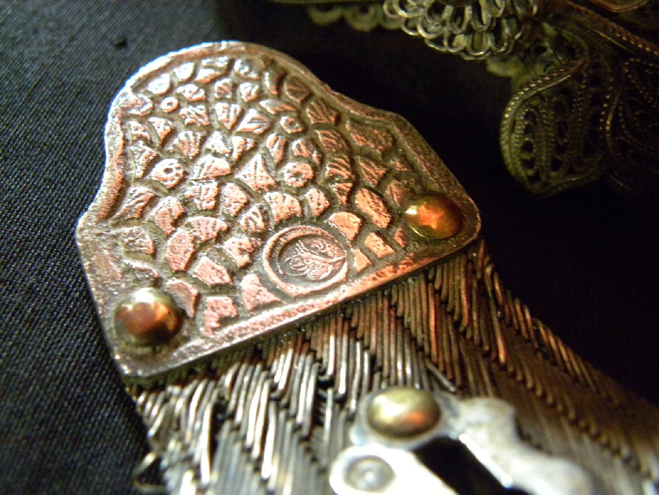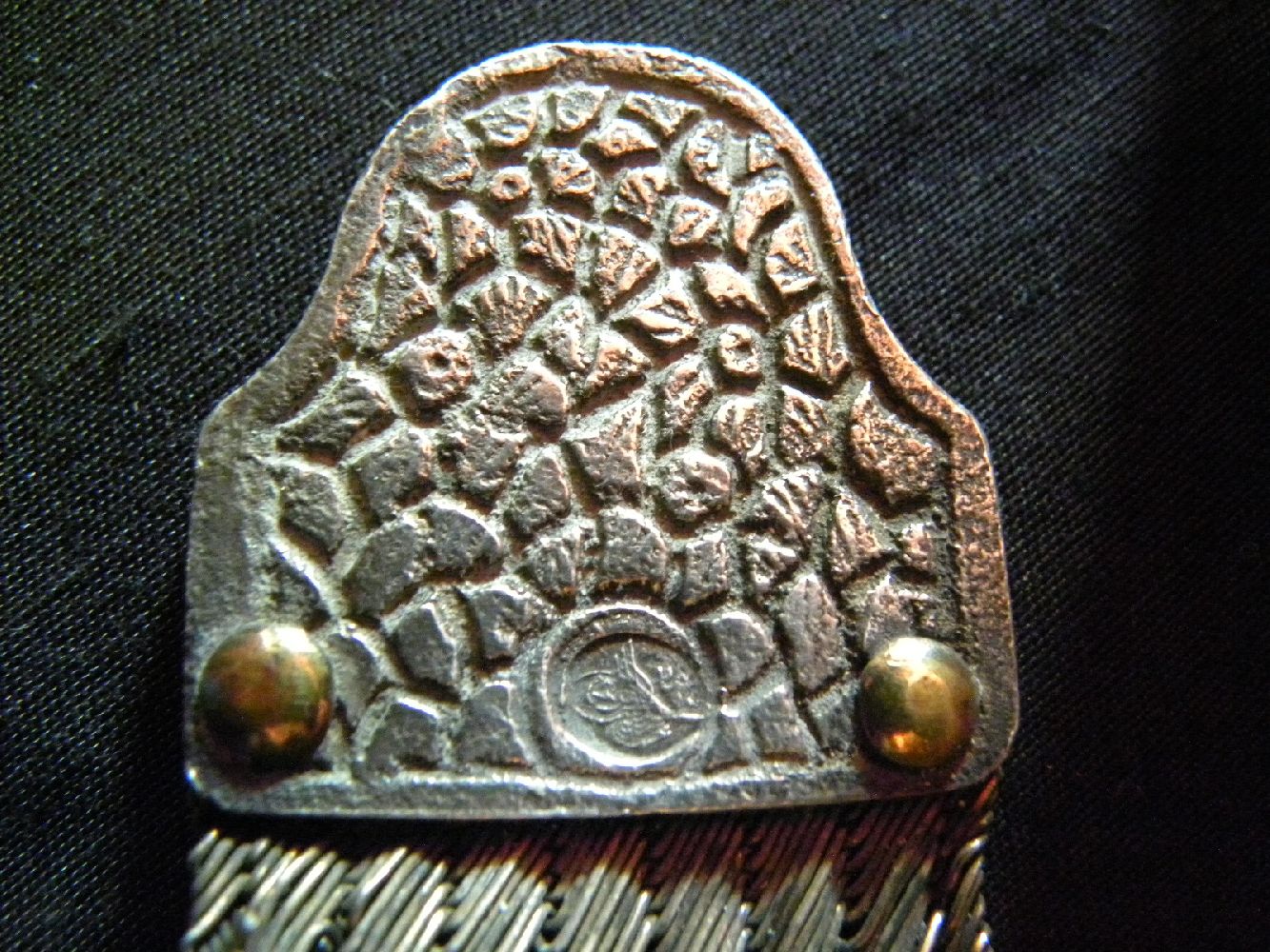 A Beautiful silver belt, Insribed with the imperial signature from an Ottoman Sultan in the 19 th century . 900 karats silver stamped in Ottoman Turkish. The buckle is fligreed with silver . The other parts of the belt are hand made silver matting. Length : 107 cm / 42.12598. This is a antique 19th century Turkish Ottoman belt made of silver. Front and sides richly decorated pattern bands of fine filigree work there is open wire work and adorned at the centre with a large round button and ornamented and it is beautifully patterned.