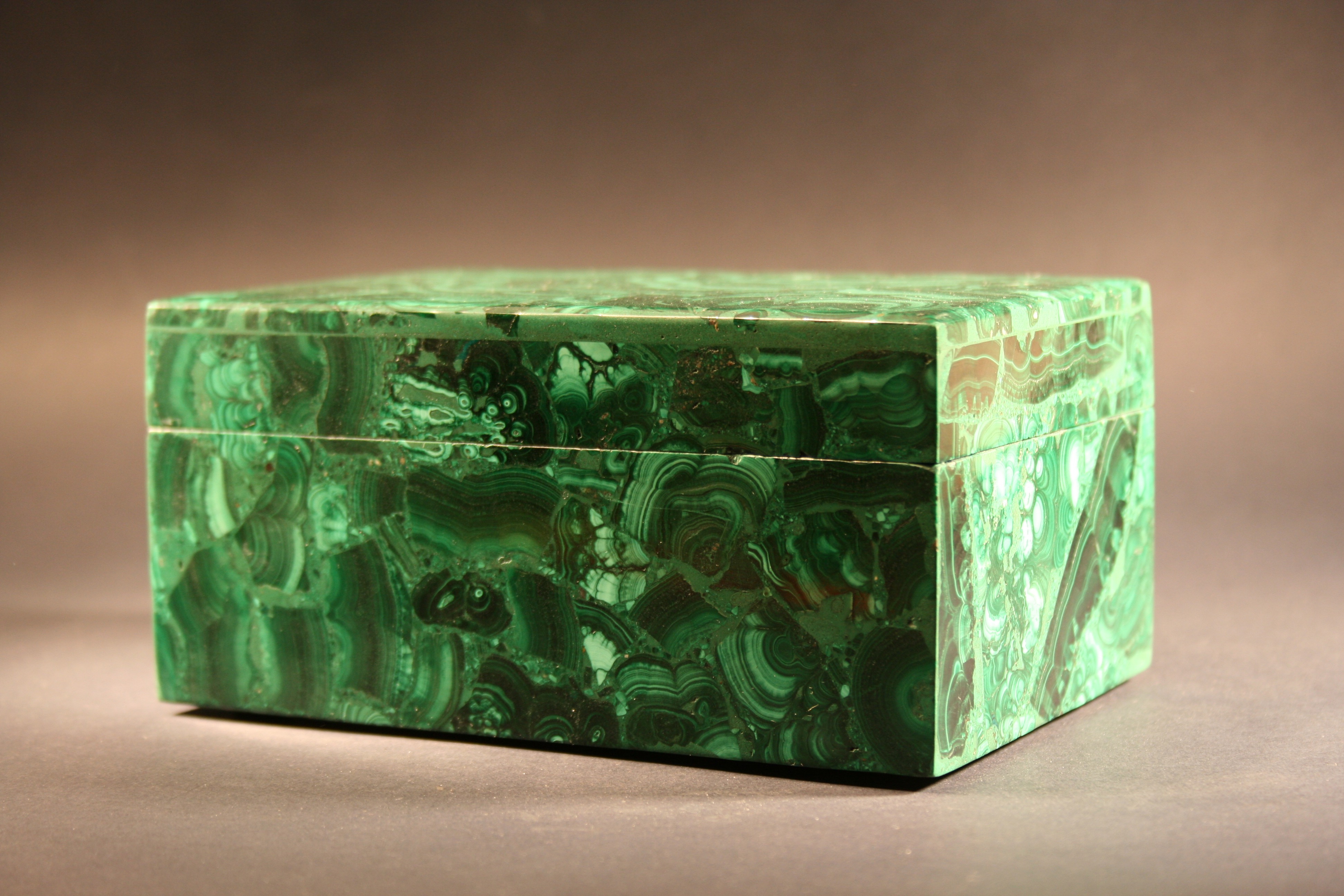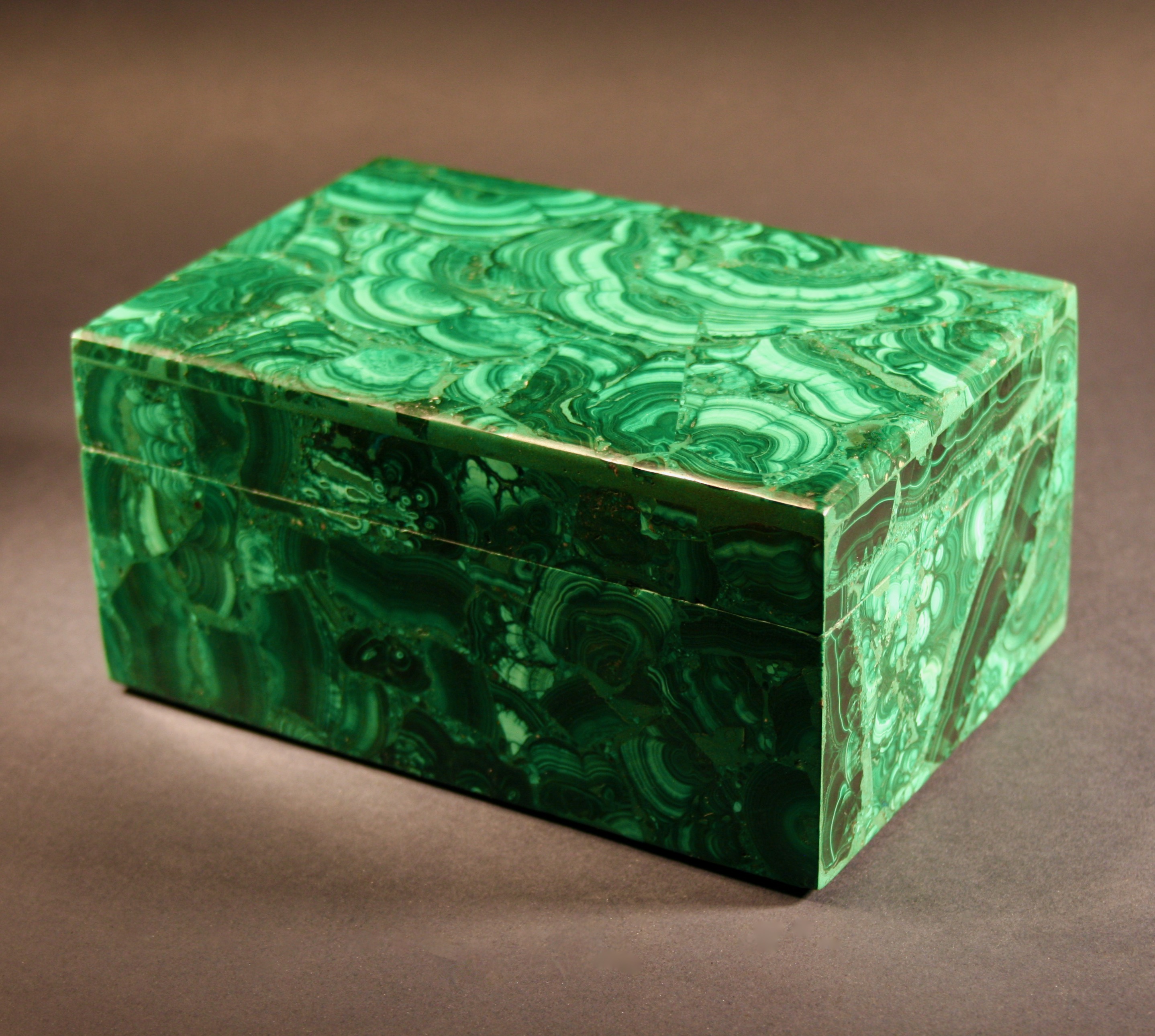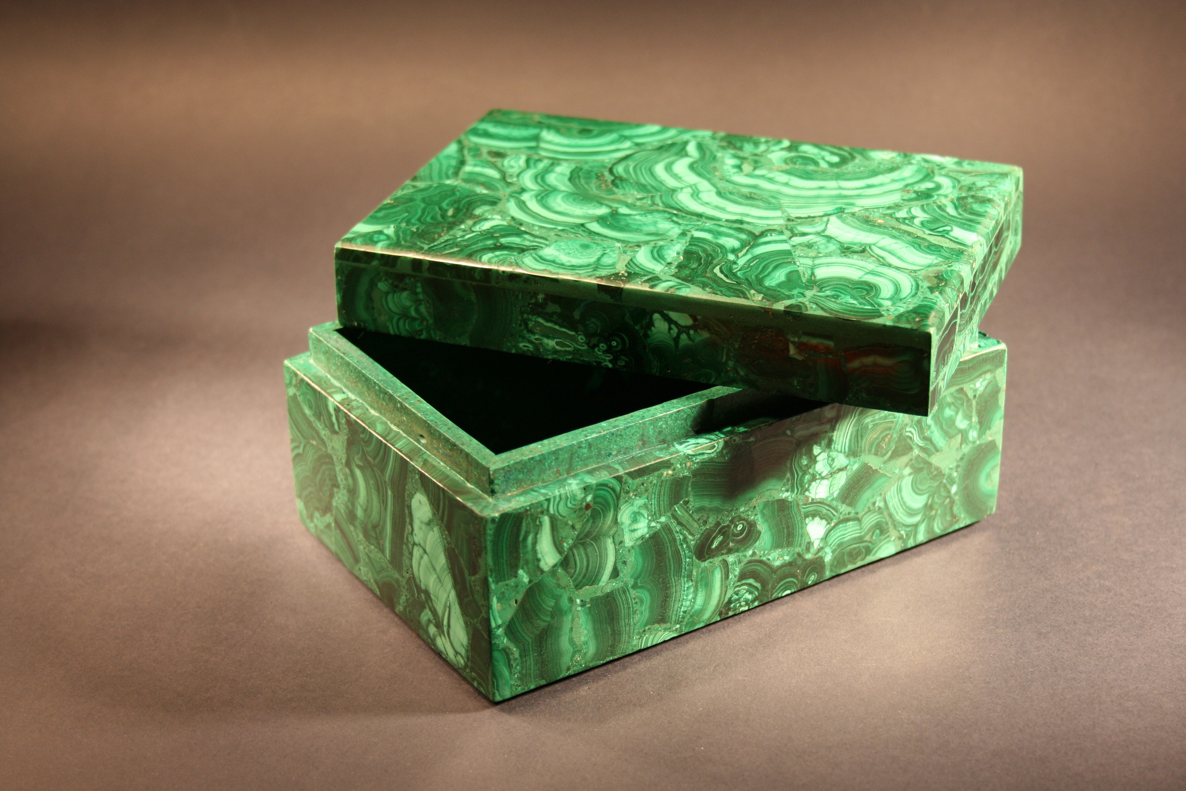 A beautiful very large rectangle malachite stone box. I am completely in love with this piece. The flawless execution by the master Italian lapidary has created the illusion of a seamless block of Malachite with incredible patterning - the inlay seams are literally invisible. Malachite from the 18th and 19th century, was sourced from Russia. Boxes, such as this, were typically brought back from Europe as "Grand Tour" souvenirs. These are natural finishes that are shown in the pictures here. If you get a chance, please have a look at the YouTube video Related to this beautiful collectible.