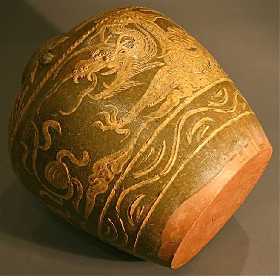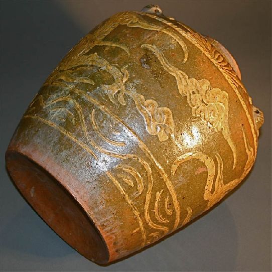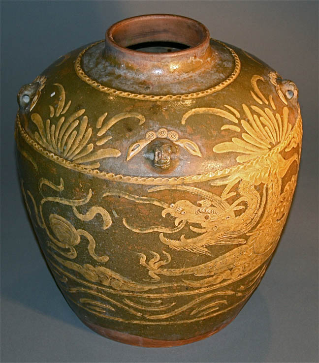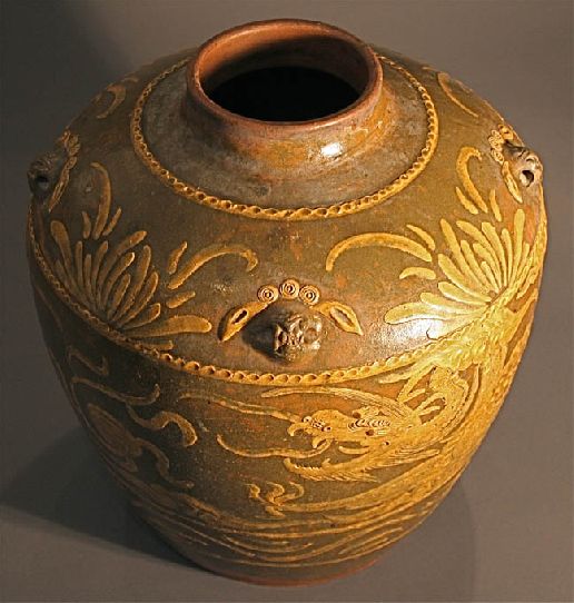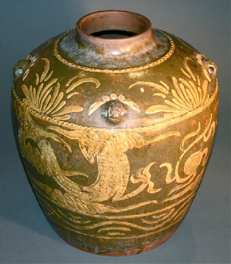 Vary old and rare Chinese hanging dragon ceramic pot jar. There is a curved knob on each of the four sides of the shoulders; The outer surface of the jar is hand mould with floral-shaped grids that are interspersed with finger line-drawn string patterns. The inside and outside of the jar are partly glazed. There is some damage, a small crack down one side of the pot jar, it was repaired a long time ago it is very hard to see.
