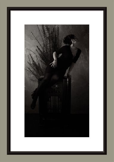 Clair (oscuro) by artist Martin Nichols: A limited edition print, one of four from the Black Dress Project shot in 2010 at the Burning Sand Studio on Canada's Sunshine Coast. Photographer Martin Nichols created these images to explore his fascination with the human form’s propensity to convey expression even though the face is partially or totally obscured. Mr Nichols has been a graphic designer for 30 years, and cites this as the major contributing factor in the strength of his photographic composition. This print is one of a limited edition of ten, and is one of four in the Black Dress Project. The print is 9.25" x 16" with a 2" white border. The piece is printed with Ultrachrome inks on 15.4 mil 300 gsm bright white, smooth matte Optica One paper. This paper is archival and acid-free and the inks are Epson Ultrachrome, giving beautiful deep rich blacks. Both ink and paper are guaranteed to hold for more than 100 years.