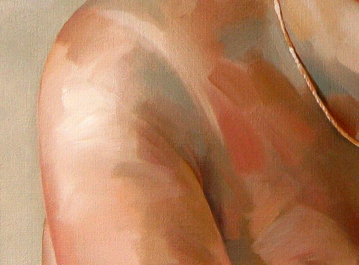 Painting by Valery Koroshilov, an award-winning contemporary master based in London and exhibiting internationally. Oil on linen/original stretcher/excellent condition. A beautiful model in the Studio. A contemplating gaze. A moment of an emotional impulse that liberates the soul from the prejudices of a conventional life. An American poet Lina Reynolds wrote about this painting in 2010: "I find your piece fascinating. The two tone background and the strokes are like stripes of life collected within and without. As our tones (experience) make up who we are, strokes of these tones are part of the variables of our experience, like night and day and the variations of going towards the sunrise and the moonrise.."