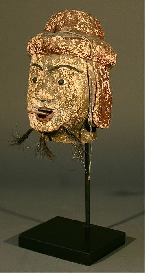 This is a clay ceramic and movable carved wooden tongue male marionette head with beard. Burmese male teakwood marionette head with beard on a custom base. This great carved head is detailed with polychrome paint and has developed an incredible patina which adds great character. He has a movable tongue with pulley mechanism.
