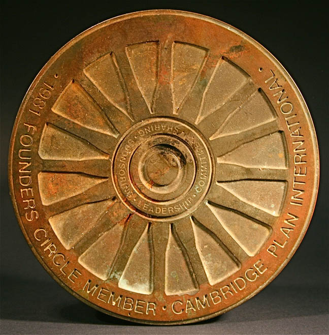 This is a large bronze amulet from 1981 founders circle member Cambridge plan international. Metal, This was given for one's leadership. The most common form of the medal is round and made of bronze, but they may be produced in any shape desired and formed of any material that is suitable for sculpting, molding, casting, striking or stamping. A medallion is a large medal which may be commemorative or produced as a work of art or souvenir, and occasionally referred to as a “table medal; in colloquial use, the term medallion is sometimes used to refer to ornamental jewelry worn as a pendant as part of a necklace. Art medals can also be produced in a parallelogram shape as a plaquette or larger plaque.