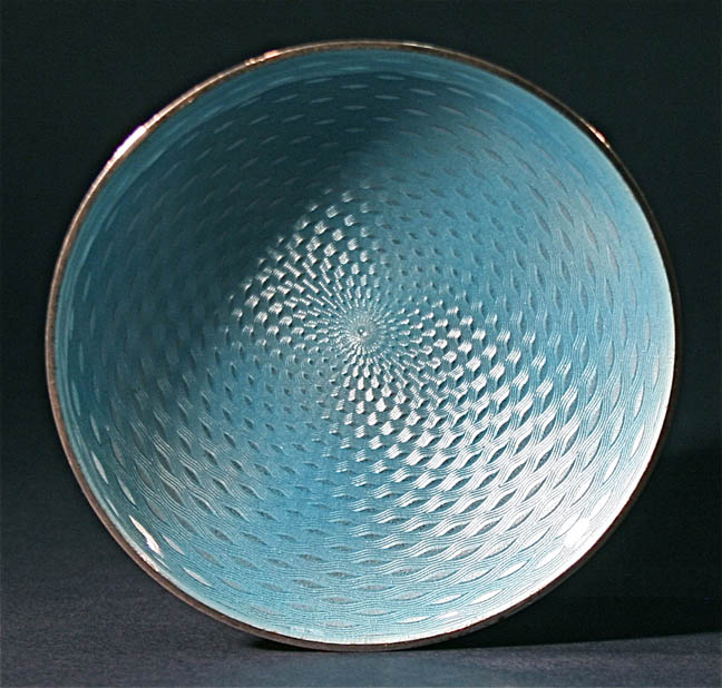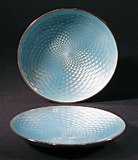 These are two antique sterling silver blue enamel painted dish plates. They are Stunning Antique Art deco dishes ~ This is very high quality. You are looking at two gorgeous vintage silver blue enamel dishes, dating to the 1920's 1930s. As you can see, these dishes are done in the most gorgeous creamy blue, with a wonderful overall decorative design. The back of the dish is all silver but without the decorative design. The condition is excellent; no enamel loss whatsoever. Some very minor wear and tiny scratches to the painted surface in places. Overall, two exceptional display pieces! Made in Denmark by Egon Lauridsun #925S