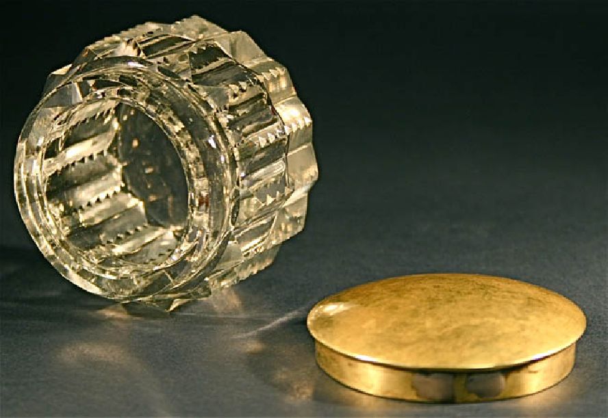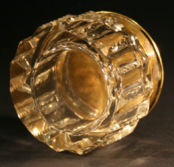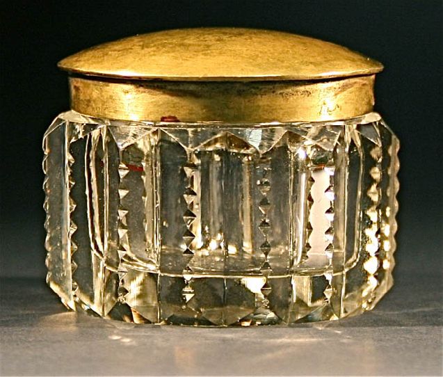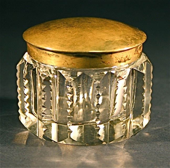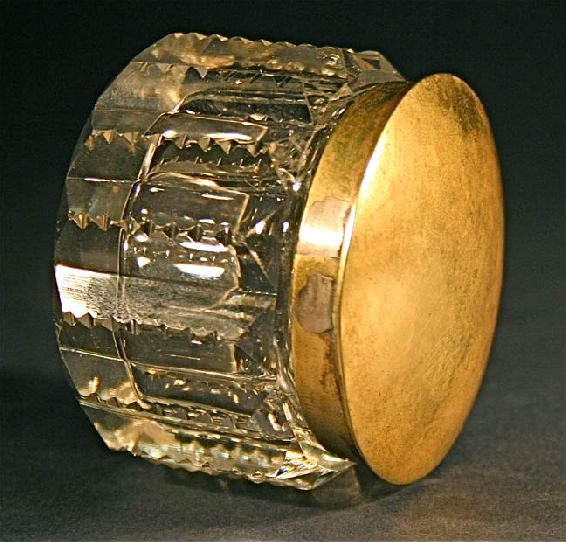 Title: Antique cut crystal bottle jar hand hammered brass top