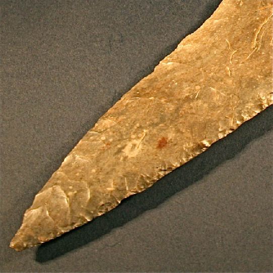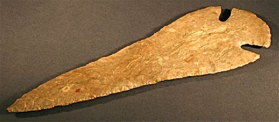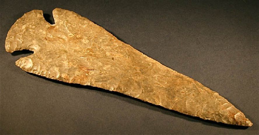 A Flint tool from the Stone Age and Iron Age spearhead A very rare and large piece of a two sided spearhead in a gray stone. Notched on both sides with very fine serrated edges. Ideal for a Collector hobbyist. An absolutely gorgeous piece! Spearheads such as this one could have been used for both hunting and warfare. We think it dates somewhere from the Early Bronze Age. beautiful display piece age unknown. Collected Native American Art and Artifact. This is a large spear head chipped stone arrowhead. This piece has no proof of age or origin. What I can tell you is the artist of this piece did a awesome job. it is beautiful.