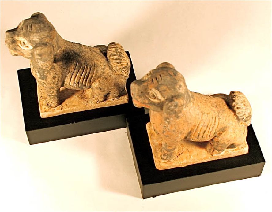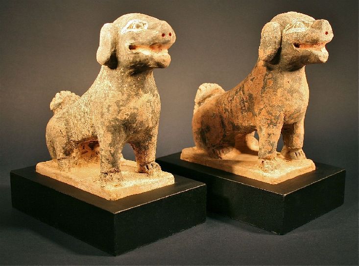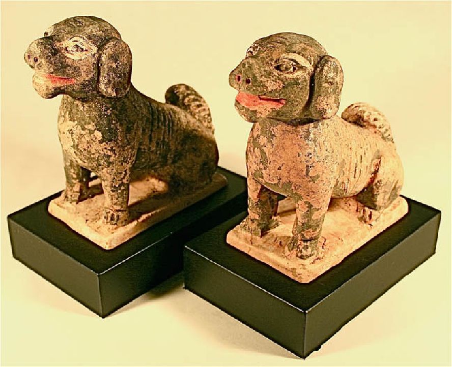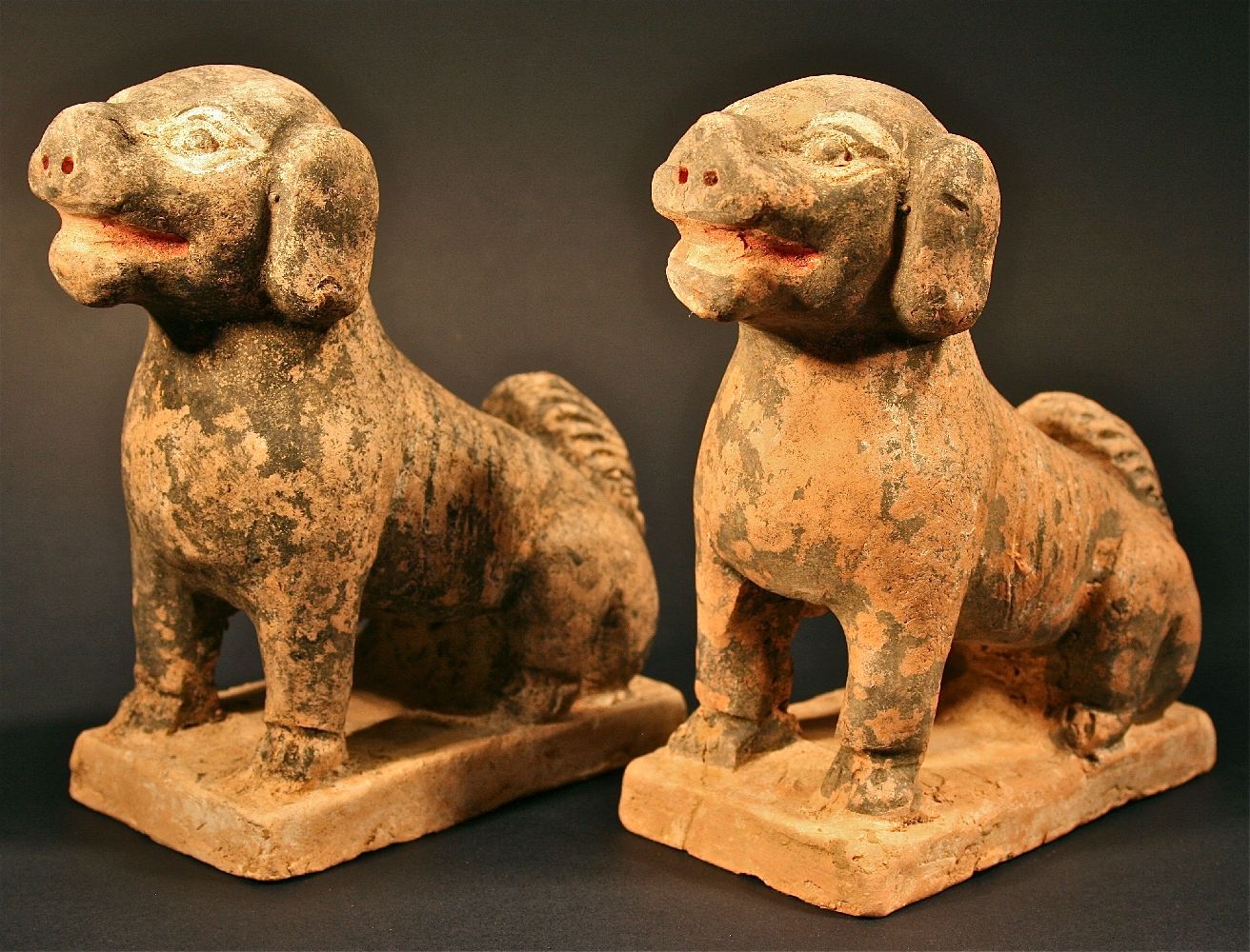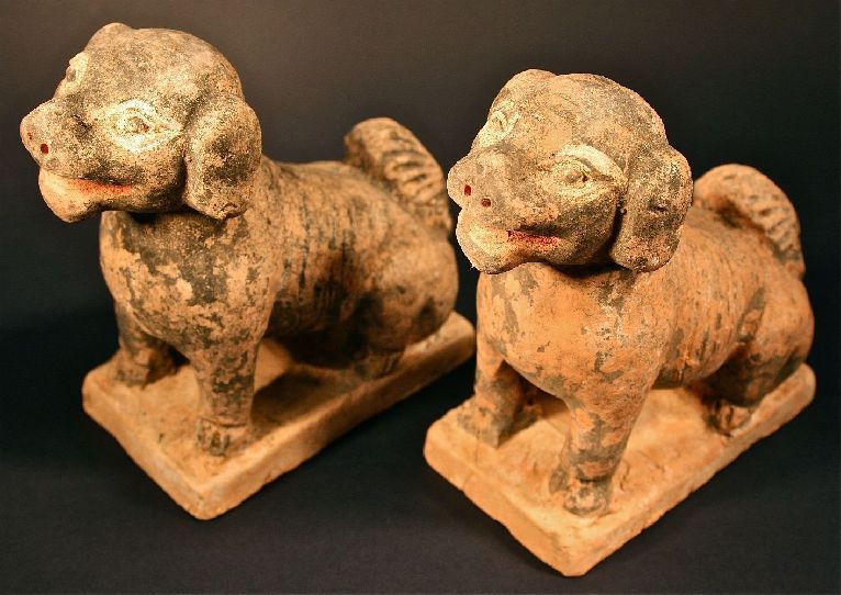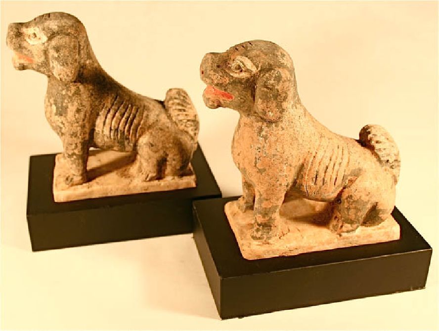 Title: Chinese Artifact Clay Terracotta Polychrome Sitting Dogs Ming Dynasty