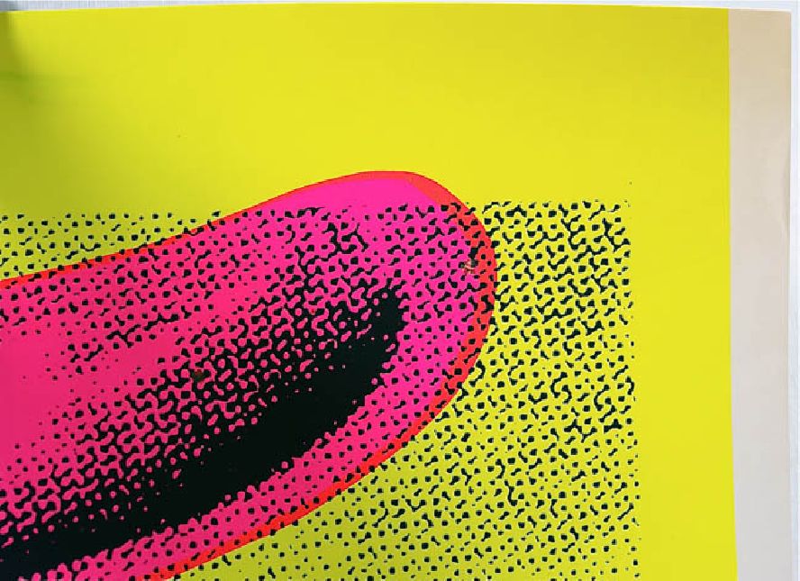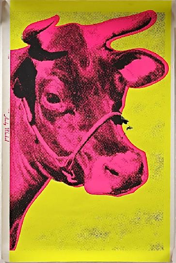 Andy Warhol (American, 1928-1987) "Cow". Screenprint on wallpaper, pink on yellow background, ca. 1966, apprx. 30-1/4" x 45-7/8" paper size, with "Andy Worhol" and "trim" printed along one edge, "trim" on the opposing edge. Not framed. By the beginning of the 1960s, Warhol had become a very successful commercial illustrator. Pop art was an experimental form that several artists were independently adopting; some of these pioneers, such as Roy Lichtenstein, would later become synonymous with the movement. Warhol, who would become famous as the "Pope of Pop", turned to this new style, where popular subjects could be part of the artist's palette. His cow wallpaper is a fine example of the artist's philosophy; not the first artist to refuse to explain his work, he urged the public to regard his images as completely on the surface with nothing behind. Condition: The sheet has been rolled for shipping; very slight repeating (6) crease from indentation of the mailing tube, mostly visible from the back of the paper. Small amount of handling wear to the edges, yellow at top end with vague soils, small crease in yellow at the lower end, one end of paper slightly discolored from age exposure verso. A few minor surface scuffs can only be seen in raking light. Not framed. Overall the condition is good.