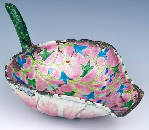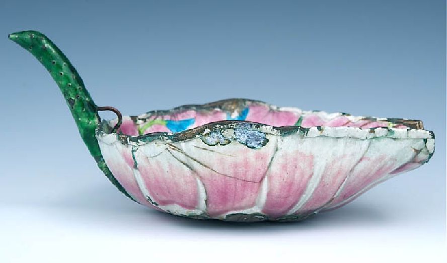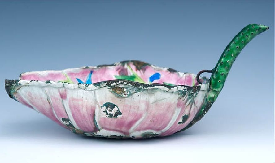 This is a very a rare hand made antique silvered copper painted enamel water dropper, it is Chinese. In the form of a lotus blossom with a handle. Enameled with a floral pattern on the interior, and lotus blossom on the exterior. Measures approx. 6"L x 4-1/3"W. Condition: Chips and losses to enamel on the rim, bottom and exterior. This is a beautiful copper enamel seemingly hand-painted water dropper, used in the calligraphy process. Water is placed into the bowl and pours out for use through the stem. This is a very special 20th century piece. Today, the market of Chinese art is widely reported to be among the hottest and fastest-growing in the world, attracting buyers all over the world. The Voice of America reported in 2006 that Chinese art is raking in record prices both internationally and in domestic markets. Sotheby's noted that Chinese art has rapidly changed the Asian art world into one of the most dynamic sectors on the international art market.