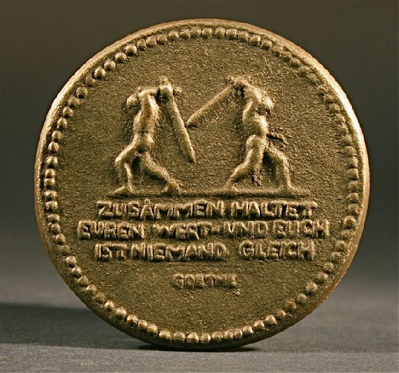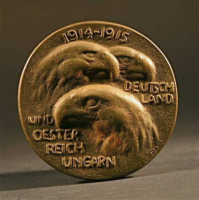 A large Steel coin of three heads of eagles 1914 1915 Deutschland Und Oester Reich Ungarn This looks like a coin or some kind of a metal from Germany. One side of this coin has three eagle heads, date 1914-1915 Deutschland Und Oesterreich Ungarn. The other side of the coin has two men Fighting. Zusammen Haltet Euren West - Und Euch Ist Nienand Gleich Goltne. Medallic Art. First World War. Germany. August Gaul (1869-1922), Iron Medal, 1915, heads of the three Eagles of Germany, Austria and Hungary, rev two naked warriors, swords raised, but facing away from each other, legend below (from Goethe), ZUSAMMEN HALTET EUREN WEST UND EUCH IST NIEMAND GLEICH, beaded border, 57.5mm (Goethe-Zitat 576). Extremely fine . August Gaul, sculptor, founding member of the Berlin Seccession, and famous for his sculptures of animals. In 1915 he served on the eastern front and many of his war drawings were published by Paul Cassirer, who also organised a major exhibition of his drawings in 1919 to mark his 50th birthday. War art is considered a genre of art. It is characterized by war, military subjects and war activities. The works described as war art represent a broad range of subject matter and styles. It includes sculpture, and other artistic media. War art includes painting, as a sub-type of history painting. Although war art is an account of one aspect of art history, it is also an expression of culture. War art combines artistic and documentary functions, and it becomes one of the significant legacies of any culture. War art by definition becomes an attempt to come to terms with the nature and reality of violence. For example, in Australia, C.E.W. Bean's Anzac Book influenced the artists who grew up between the two world wars. When these Australians were asked to depict a second multi-nation war after 1939, there was a precedent and format for them to follow.[ War art is typically realistic; but its definition of accuracy emphasizes not only factual, eyewitness detail but also the emotional impression and impact of events. War art is artwork conceived and executed by people involved in war in some manner. In other words, the subject can be parsed according to who creates it, as for example, • artists officially commissioned either to spend varying periods of wartime under fire or to be present at nearly every kind of military activity, in order to record them • servicemen-artists responding to powerful inner urges to depict direct war experience • sensitive onlookers