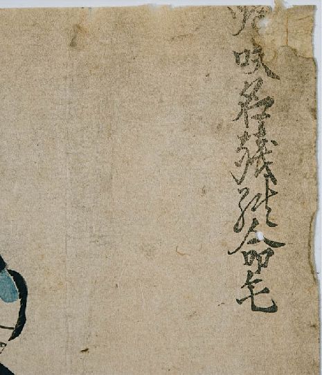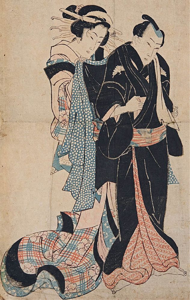 Eizan (Kikugawa) (Japanese, 1787-1867) Geisha attending Samurai. Woodblock print in colors, apprx. 13" x 9-1/4", unframed. Signed at the right side, a publisher's seal of Mori-ya Jihei (Mori-Ji) Kinshindo (ca. 1800-1850), and a seal (ca. 1790-1804). Condition: Wear, soils, folds and creases, losses; see detail photograhs. The Edo or Tokugawa period (1605-1868) in Japan's history witnessed the rise of the chōnin, the prosperous urban-based merchant class. The chōnin were deprived of participation in the political running of the country by the military elite. Therefore they channelled their energies into developing a vibrant consumer culture, involving leisure pursuits, patronage of the arts and an indulgence in material luxury. Their playground for displays of conspicuous consumption was Edo's (modern Tokyo) Yoshiwara district, which housed the city's licensed brothels, theatres and tea houses. In the Yoshiwara district, spectacularly robed oiran (the highest ranking courtesans) could be seen parading with their attendants on their way to an assignation. This could take an inordinate length of time over a relatively short distance as the courtesan exploited the impact of her superb appearance by walking in a highly mannered style at a very slow pace. The spectacle of promenading courtesans was a favourite subject for ukiyo-e artists. Eizan, took delight in depicting the courtesan's highly ornate robes, an important element of parade and display. They are decorated with poem cards or shikishi (popular motifs for textile designs) which were used for writing poetry and painting small images. Images in books were almost always in monochrome (black ink only), and for a time art prints were likewise monochrome or done in only two or three colors. The text or image would first be drawn onto washi (Japanese paper), and then glued onto a plank of wood, usually cherry. Wood would then be cut away, based on the outlines given by the drawing. A small wooden hard object called a baren would be used to press or burnish the paper against the inked woodblock, thus applying the ink onto the paper. Although this may have been done purely by hand at first, complex wooden mechanisms were soon invented and adopted to help hold the woodblock perfectly still and to apply proper pressure in the printing process. This would be especially helpful once multiple colors began to be introduced, and needed to be applied with precision atop previous ink layers. Text was nearly always monochrome, as were images in books, the growth of the popularity of ukiyo-e brought with it demand for ever increasing numbers of colors and complexity of techniques.