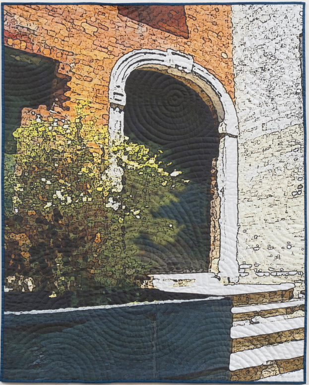 Soft City: Archway by artist Marilyn Henrion. Digitally manipulated photography, inkjet printing on cotton, hand quilted. Anodized aluminum hanging bars included (invisible from front). As a native New Yorker, the artist created this series of works to represent her personal take on the city, revealing its soft side, with unexpected visual treats lurking around every corner. Once Gotham’s hard unyielding surfaces are peeled back, the beautiful and complex patina of each facade is illuminated. These mixed media works represent a fusion of past and present. Ancient needlework techniques are combined with digitally manipulated photography and inkjet printing to create works of art that reflect contemporary aesthetic sensibilities. The presence of the hand stitching both animates the surfaces of the works and, at the same time, softens and humanizes the urban geometry by the irregular qualities of texture inherent in the materials and construction. Marilyn Henrion (Associate Professor, Placement Dept.) has achieved international recognition as an artist. Honored by the Smithsonian Institution by inclusion in The Archives of American Art, her work has been exhibited throughout the world and is included in major corporate, museum and private collections such as the Museum of Art and Design in NY, the U.S. Embassy in Pnom Penh, Cambodia, Lucent Technologies, Avaya Corporation, etc.
