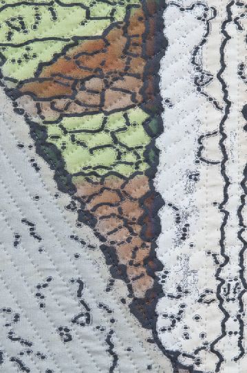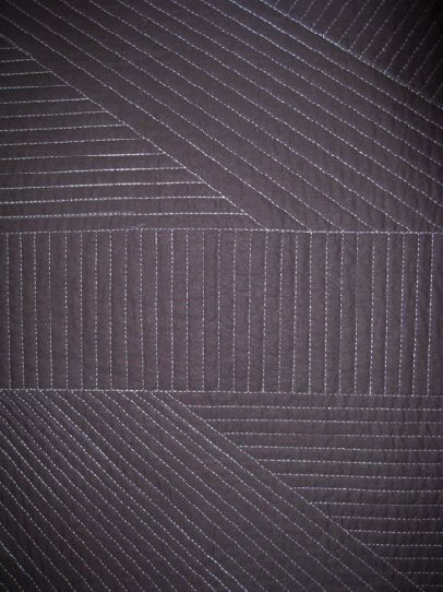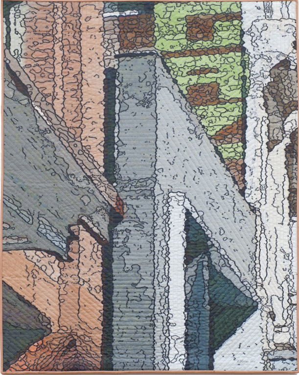 Soft City: Gaz by artist Marilyn Henrion. Digitally manipulated photography, inkjet printing on cotton, hand quilted. Anodized aluminum hanging bars included (invisible from front). As a native New Yorker, the artist created this series of works to represent her personal take on the city, revealing its soft side, with unexpected visual treats lurking around every corner. Once Gotham’s hard unyielding surfaces are peeled back, the beautiful and complex patina of each facade is illuminated. These mixed media works represent a fusion of past and present. Ancient needlework techniques are combined with digitally manipulated photography and inkjet printing to create works of art that reflect contemporary aesthetic sensibilities. The presence of the hand stitching both animates the surfaces of the works and, at the same time, softens and humanizes the urban geometry by the irregular qualities of texture inherent in the materials and construction. Marilyn Henrion (Associate Professor, Placement Dept.) has achieved international recognition as an artist. Honored by the Smithsonian Institution by inclusion in The Archives of American Art, her work has been exhibited throughout the world and is included in major corporate, museum and private collections such as the Museum of Art and Design in NY, the U.S. Embassy in Pnom Penh, Cambodia, Lucent Technologies, Avaya Corporation, etc.