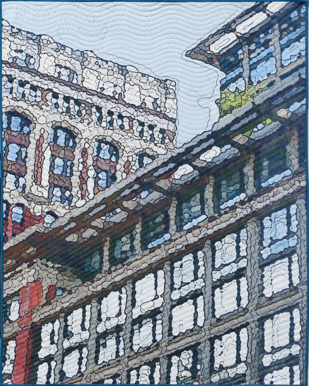 Soft City: Broadway Windows by artist Marilyn Henrion. Digitally manipulated photography, inkjet printing on cotton, hand quilted. Anodized aluminum hanging bars included (invisible from front). As a native New Yorker, the artist created this series of works to represent her personal take on the city, revealing its soft side, with unexpected visual treats lurking around every corner. Once Gotham’s hard unyielding surfaces are peeled back, the beautiful and complex patina of each facade is illuminated. These mixed media works represent a fusion of past and present. Ancient needlework techniques are combined with digitally manipulated photography and inkjet printing to create works of art that reflect contemporary aesthetic sensibilities. The presence of the hand stitching both animates the surfaces of the works and, at the same time, softens and humanizes the urban geometry by the irregular qualities of texture inherent in the materials and construction. Marilyn Henrion (Associate Professor, Placement Dept.) has achieved international recognition as an artist. Honored by the Smithsonian Institution by inclusion in The Archives of American Art, her work has been exhibited throughout the world and is included in major corporate, museum and private collections such as the Museum of Art and Design in NY, the U.S. Embassy in Pnom Penh, Cambodia, Lucent Technologies, Avaya Corporation, etc.