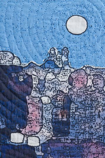 Soft City: Twilight II by artist Marilyn Henrion. Digitally manipulated photography, inkjet printing on cotton, hand quilted. Mounted and framed (2"frame). As a native New Yorker, the artist created this series of works to represent her personal take on the city, revealing its soft side, with unexpected visual treats lurking around every corner. Once Gotham’s hard unyielding surfaces are peeled back, the beautiful and complex patina of each facade is illuminated. These mixed media works represent a fusion of past and present. Ancient needlework techniques are combined with digitally manipulated photography and inkjet printing to create works of art that reflect contemporary aesthetic sensibilities. The presence of the hand stitching both animates the surfaces of the works and, at the same time, softens and humanizes the urban geometry by the irregular qualities of texture inherent in the materials and construction.