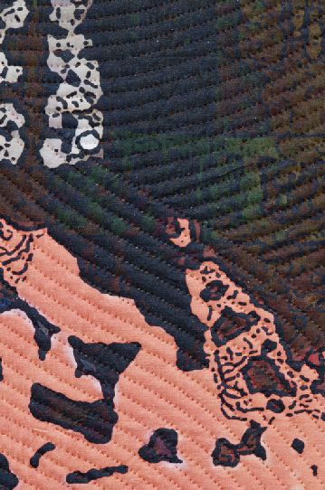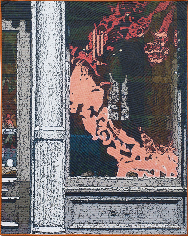 Soft City: Red dragon by artist Marilyn Henrion. Digitally manipulated photography, inkjet printing on cotton, hand quilted. Anodized aluminum hanging bars included (invisible from front). As a native New Yorker, the artist created this series of works to represent her personal take on the city, revealing its soft side, with unexpected visual treats lurking around every corner. Once Gotham’s hard unyielding surfaces are peeled back, the beautiful and complex patina of each facade is illuminated. These mixed media works represent a fusion of past and present. Ancient needlework techniques are combined with digitally manipulated photography and inkjet printing to create works of art that reflect contemporary aesthetic sensibilities. The presence of the hand stitching both animates the surfaces of the works and, at the same time, softens and humanizes the urban geometry by the irregular qualities of texture inherent in the materials and construction.
