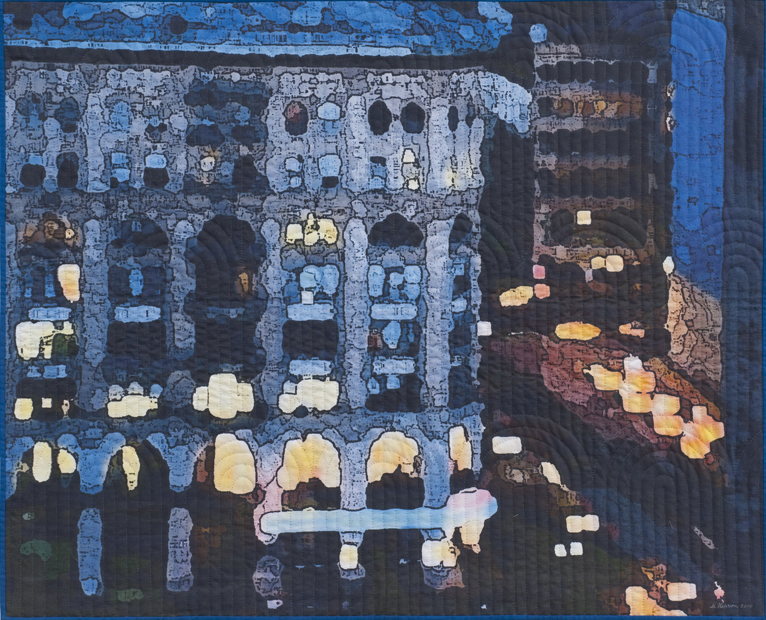 Soft City: Angelika by artist Marilyn Henrion. Digitally manipulated photography, inkjet printing on cotton, hand quilted. Anodized aluminum hanging bars included (invisible from front). As a native New Yorker, the artist created this series of works to represent her personal take on the city, revealing its soft side, with unexpected visual treats lurking around every corner. Once Gotham’s hard unyielding surfaces are peeled back, the beautiful and complex patina of each facade is illuminated. These mixed media works represent a fusion of past and present. Ancient needlework techniques are combined with digitally manipulated photography and inkjet printing to create works of art that reflect contemporary aesthetic sensibilities. The presence of the hand stitching both animates the surfaces of the works and, at the same time, softens and humanizes the urban geometry by the irregular qualities of texture inherent in the materials and construction.