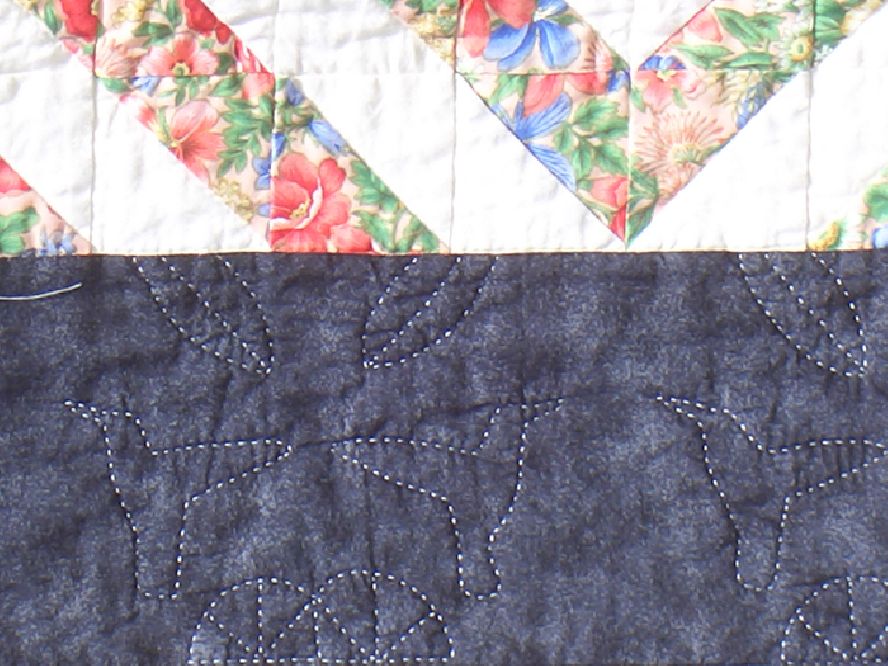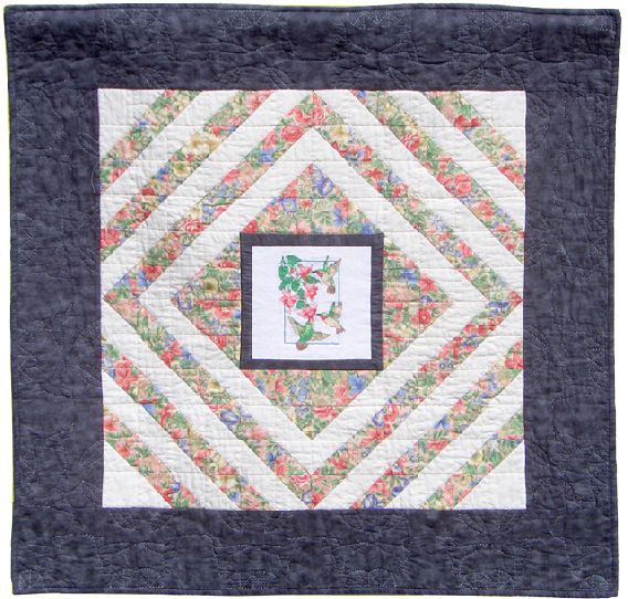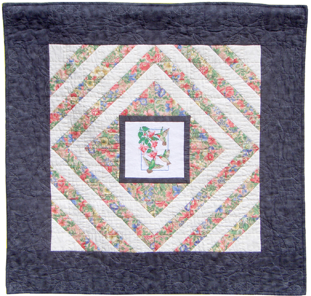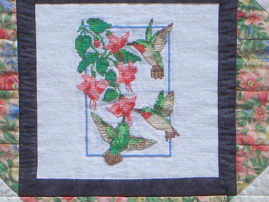 The quilting stitches are heirloom-quality and greatly enhance the overall design of the piece. The hand quilting of the hummingbird silhouettes in the black border gives this piece its finishing touch. The hand quilting was done to complement the hummingbirds in the Aida cloth cross stitched center panel. A wonderful floral patterned fabric as well as a muted Oriental print is incorporated around the hummingbirds giving the illusion that they are suspended in an Oriental flower garden. This is the second quilt in a series of quilts utilizing a hand cross stitched panel as the center medallion. The backing is traditional unbleached muslin and is signed and dated by the textile artist.