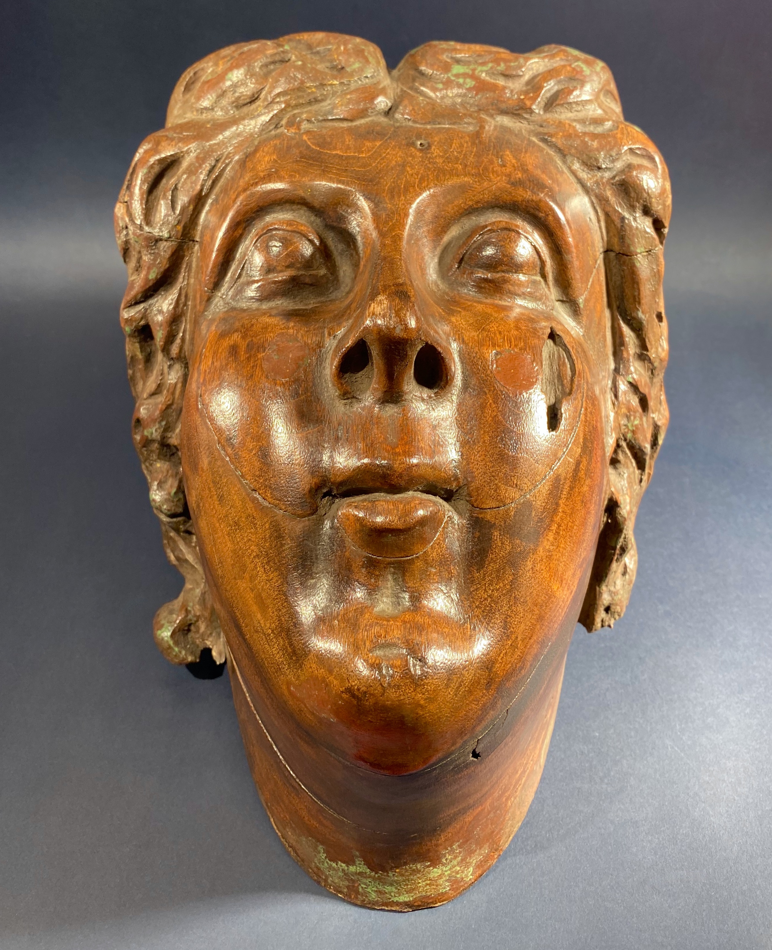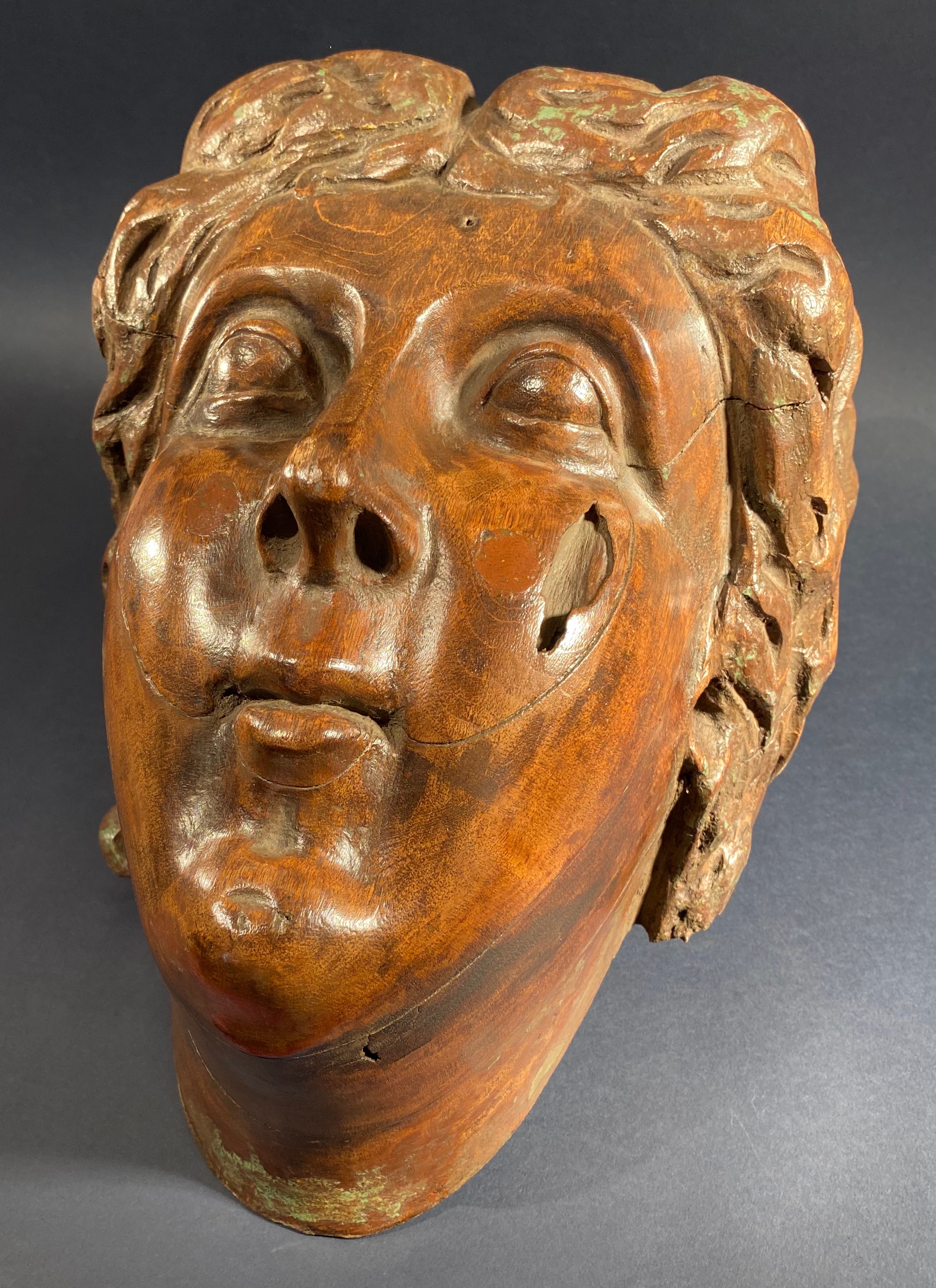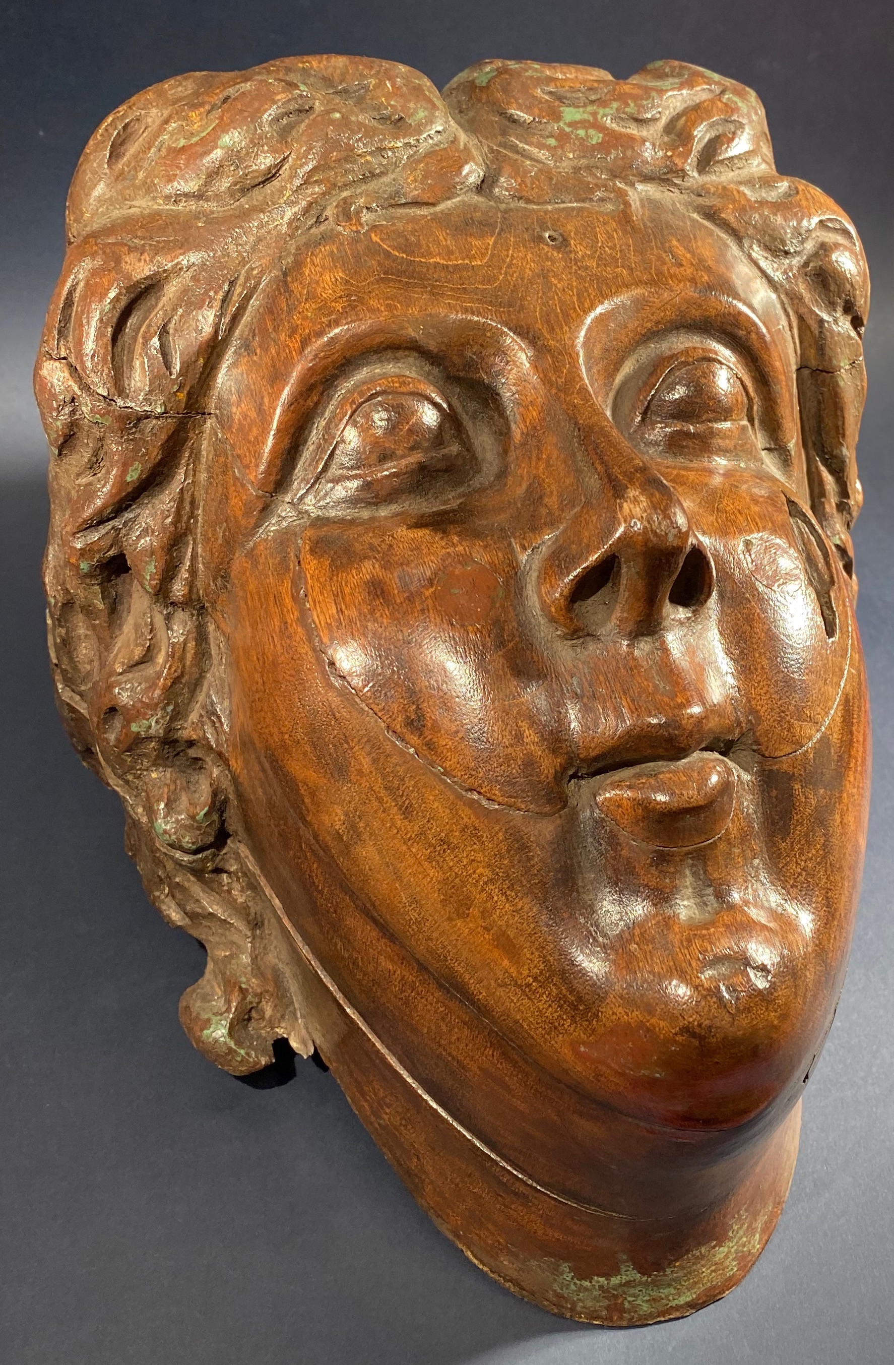 Fabulous antique carved head of a Spanish woman not sure what this was carved for. Super unusual fantastic look. Very large it was laminated in four sections. I am not sure what kind of wood it is carved from but it looks like a beautiful hardwood of some sort. During the early 18th and 19th centuries in Spain, there was a tradition of hand-carving wooden faces that was part of the larger tradition of religious art. These carved wooden faces were often used as part of larger religious statues, such as those of the Virgin Mary, saints, and other religious figures. The art of hand-carving wooden faces in Spain had a long history, dating back to the Middle Ages, when wooden statues were used to decorate churches and cathedrals throughout the country. However, it was during the 18th and 19th centuries that this art form reached its peak. Artisans and craftsmen who specialized in carving wooden faces would often work in teams, with each member of the team specializing in a particular aspect of the carving process. The process would usually start with a sketch or design, which would then be transferred onto the wooden block. The block would then be roughed out and the basic shape of the face would be carved. Once the basic shape was established, the details would be added, such as the eyes, nose, and mouth. The artisans would use a variety of tools, such as chisels, gouges, and knives, to create the intricate details of the face. The finished product would be sanded and polished to give it a smooth, finished look. These carved wooden faces were often painted and adorned with other decorative elements, such as gold leaf, to make them even more striking. They were used in religious processions and displayed in churches throughout Spain. The tradition of hand-carving wooden faces in Spain continued into the 20th century, but with the advent of mass production and modern materials, the art form began to decline. However, there are still artisans and craftsmen in Spain who continue to carry on this tradition, creating beautiful works of art that are cherished by collectors and art enthusiasts around the world.