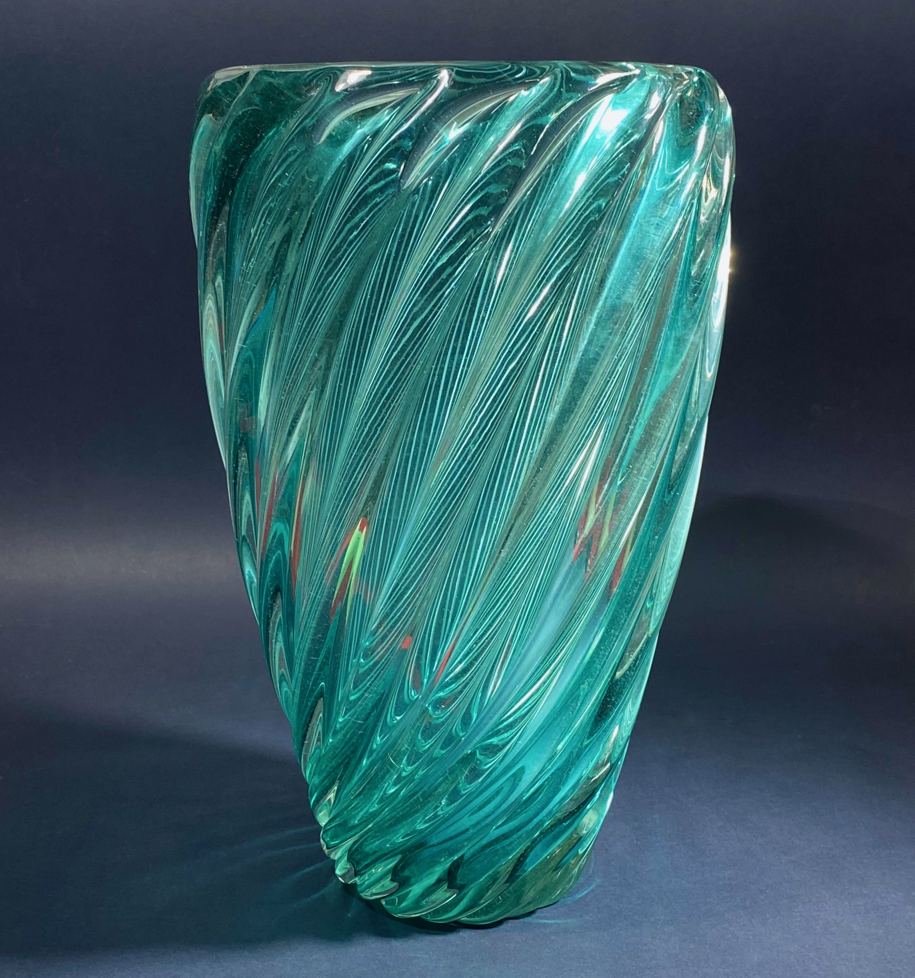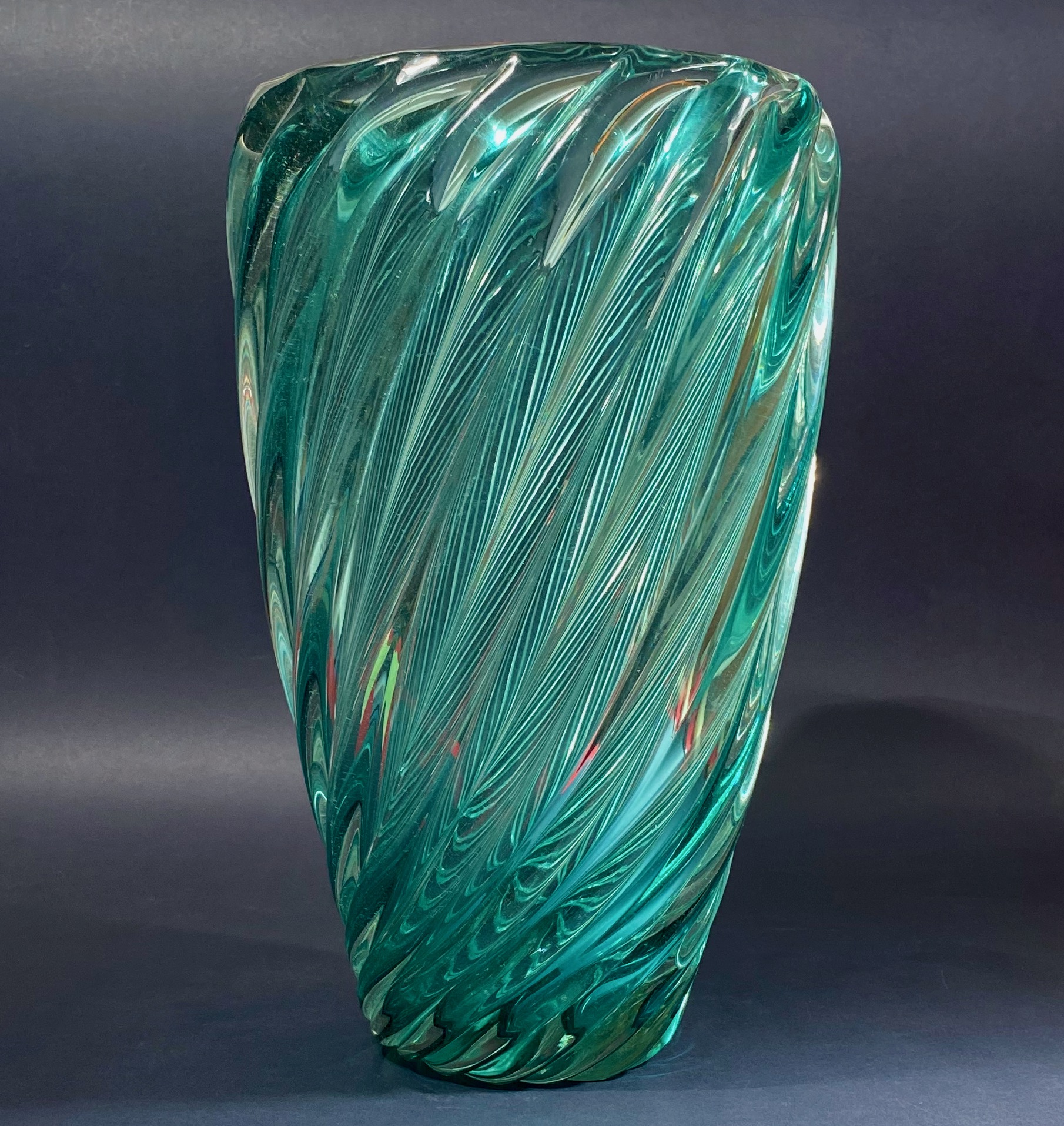 Highly collectible, rare opportunity / Vintage Venetian Italian Glass Artist Carlo Scarpa - Venini / ‘Mezza Diamante’ size 12 inches tall / Hand signed. Green Clear Spiraling Cane Sculptured Glass Vase. Dates from around the 1940s from the Venini Blvepages. Condition excellent / It is listed in 'Venini Catalog’ / Asking $4,500. This hand-blown green one-of-a-kind piece of twisted glass is ingeniously textured, colored, and shaped. This hand-blown piece of clear green glass forces you to think about how form and process achieve meaning on their own, without a clear-cut narrative, or a hushed relationship to, say, abstraction. A very similar vase smaller SOLD in blue, at wright auctions on 5 Jun 2019 for $5000 US. If this piece of rare green glass, came up for auction we predict it would sell for over $5000 easily. The Venini Company, 1932-1947,” Form, beauty, originality, and art for art’s sake. Scarpa's, glass sculptures were inspired by Chinese jade. Over 300 vessels that Carlo Scarpa (1906-78) designed for Venini, a leading Venetian glassmaker, in only 15 years, achieving a career’s worth of innovation and beauty before he turned full-time to architecture. While well known in art and design circles, Scarpa, who was born in Venice, is hardly a household name, even in Italy. The extent of his innovations in glass has only recently been reconfirmed by research in Venini archives long believed lost in a 1972 fire. Scarpa trained as an architect but refused to take the necessary exam to qualify for a license, which meant he always had to work with other architects. Nonetheless, he would become best known for brilliant renovations of some of Italy’s landmark buildings and museums, primarily in Venice and the Veneto, including the Gallerie dell’Accademia, and would be admired by Frank Lloyd Wright and Louis Kahn. Before Scarpa’s architecture, however, came his glass. When only 20, in 1926, he joined the staff of Cappellin, another Venetian glassmaker, and began to learn the chemical and physical properties of his medium and the delicate art of working with master craftsmen. After Cappellin went bankrupt in 1932, Scarpa was hired by Paolo Venini, who had left Cappelin to open his own glassworks (still in operation) on the island of Murano in 1925. Venini was already getting credit for bringing Venetian glassmaking into the 20th century, but now the process accelerated. From 1932 to 1940, to mounting praise, the Venini company introduced new series and techniques, almost all designed by Scarpa, at the Venice Biennale and the Milan Triennale. Scarpa’s superbly sculptural objects were ahead of their time. Most look as if they were made in the ’50s or even the ’60s. This is put in perspective in the show, which includes four Venetian glass bowls from the 1870s that Venini collected and that informed his and Scarpa’s work. (They are now in the Met’s collection.) Scarpa collaborated with Venini, and expanded on the ancient millefleur technique but used it in an original manner. Scarpa would go on to architecture in which glass, and light, played important roles. But his Venini years constitute a remarkable, almost self-contained burst of creativity, and devotion to objects of inspiring wholeness. Process, form, and decoration become a single thing. Art, craft, and science merge. Around this incredible glass artist.