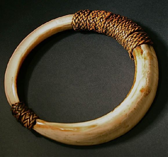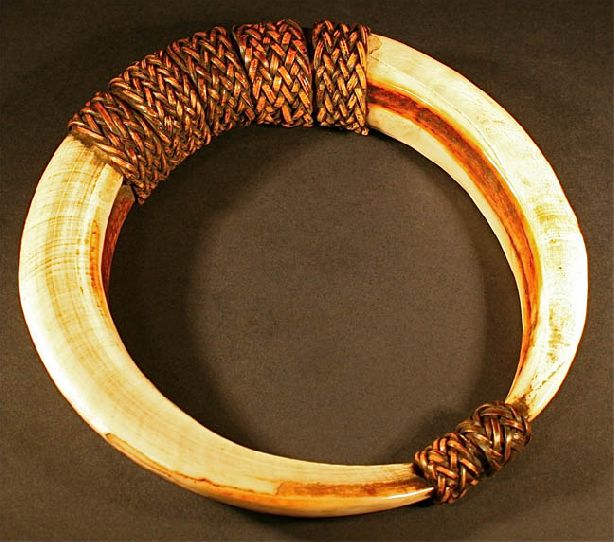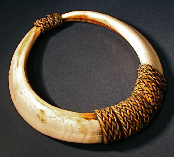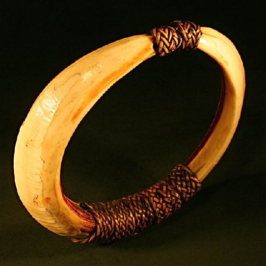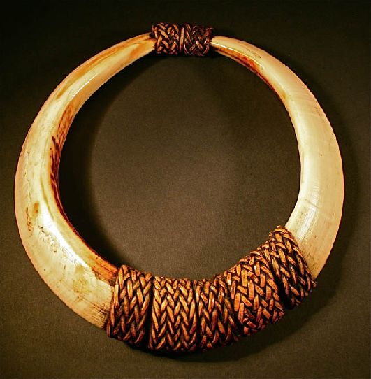 Pig tusk Bracelet piece with bilum string binding. Ivory Bracelet, Tribal Jewelry Art. 19th Century pig Ivory Bracelet, tribal jewelry Art This is a superb antique ivory art. The bracelet has an extraordinary patina. Bone is also used. Sometimes a deceased relative's or an enemy's bones are worn as a remembrance and as a way to attract their spiritual power. Among some of the Highland people, smoked human fingers and hands were worn on necklaces. Bracelet ornamented with small bindings.
