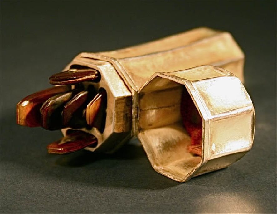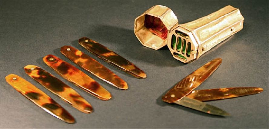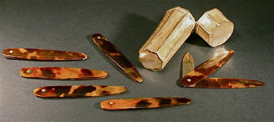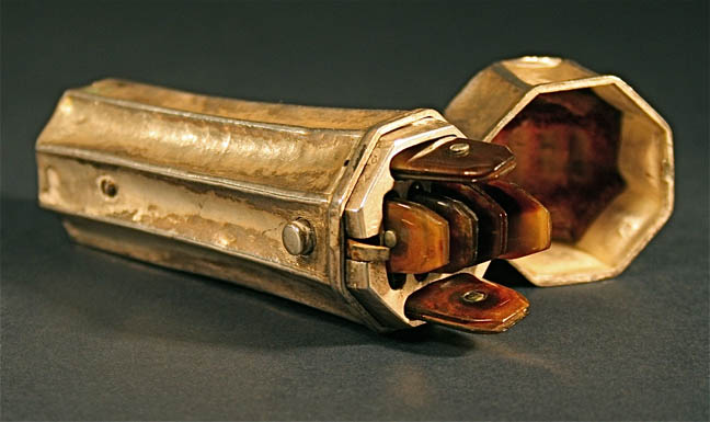 Sterling Doctor's Lancet Compendium for Bleeding. This is a very rare antique doctor's lancet compendium Bloodletting silver box tool with tortoise shell implements. So cool, this is a sterling Doctor's Lancet Compendium for Bleeding with tortoise shell implements. A beautiful octagonal metal ( handmade silver box ) lancet case from the 18th to 19th century. The case is ornately carved and in excellent condition, the hinge is sound and the latch closes firmly. Containing 6 lancets in good condition made from black brown tortoise shell. A blood lancet, or simply lancet, is a small medical implement, similar to a small scalpel but with a double-edged blade or needle. Lancets are used to make punctures to obtain small blood specimens. A blood-sampling device, also known as a lancing device, is a reusable instrument equipped with a lancet. The depth of skin penetration can be adjusted for various skin thicknesses. Bloodletting was used to treat almost every disease. One British medical text recommended bloodletting for acne, asthma, cancer, cholera, coma, convulsions, diabetes, epilepsy, gangrene, gout, herpes, indigestion, insanity, jaundice, leprosy, ophthalmia, plague, pneumonia, scurvy, smallpox, stroke, tetanus, tuberculosis, and for some one hundred other diseases. Bloodletting was even used to treat most forms of hemorrhaging such as nosebleed, excessive menstruation, or hemorrhoidal bleeding. Before surgery or at the onset of childbirth, blood was removed to prevent inflammation. Before amputation, it was customary to remove a quantity of blood equal to the amount believed to circulate in the limb that was to be removed. Leeches became especially popular in the early nineteenth century. In the 1830s, the French imported about forty million leeches a year for medical purposes, and in the next decade, England imported six million leeches a year from France alone. Through the early decades of the century, hundreds of millions of leeches were used by physicians throughout Europe.