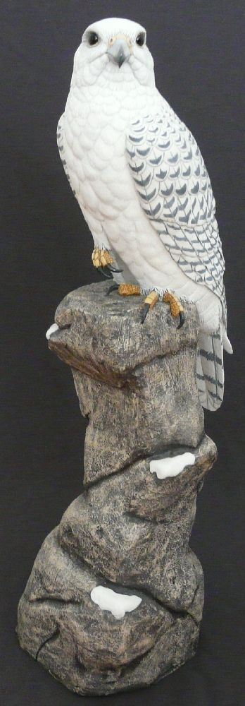 A remarkable work of art. This bird is hand painted and carved by hand, by the artist Tim McEachern, it is a one of a kind carving. Gyrfalcon(white phase) Adult male 20 inch length. This Sculpture from Tupelo wood and acrylic is inspired by being the largest most powerful falcon in the world and during medieval times particularly the white phase gyrfalcon was sought after by only kings and queens as a sign of wealth and power and only they were allowed to have them. There rarity and beauty alone drove me to intense research and understanding of such a magnificent "Bird of Prey"