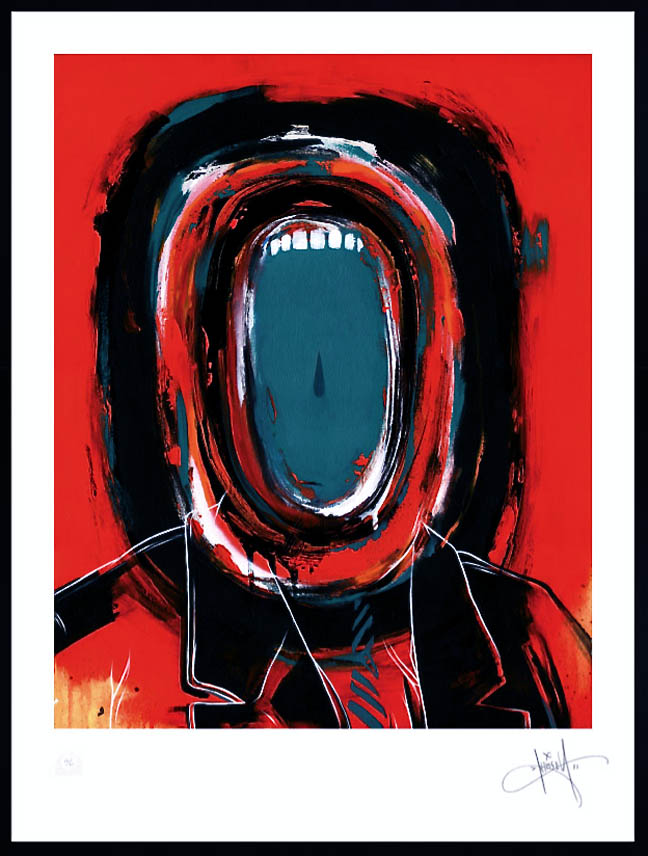 Here is a fun print called 'The Scream' by artist Dave Kinsey. This is a 4 colour 18 x 24 inch screenprint with an edition size of 100, comes signed and numbered by the artist. This is a Great print, is 18 x 24" 4 color screenprint on 100% cotton rag paper. Signed & numbered edition of 100. Dave Kinsey was born in Pittsburgh in 1971, attending the Art Institute of Pittsburgh and the Art Institute of Atlanta before moving to California in 1994 to pursue a career as a designer and fine artist. His work attempts to capture the universal essence of the human condition mainly through a symbolic portrayal of contemporary life. Utilizing a range of mediums, he constructs multi-layered, textured environments that echo the complexities of our existence. His fine art has been shown in galleries and museums worldwide—among these have been exhibitions at the URBIS Museum in Manchester, UK, NEXT Chicago, Joshua Liner Gallery in NY, Alice Gallery and Art Brussels in Belgium. His work has been featured in multiple local and international print and online publications from The New York Times and Washington Post to The Citrus Report. He has also been invited to speak at institutions such as the Pasadena Art Center, UCLA, Montserrat College of Art and the Semi-Permanent conference in Sydney, Australia.