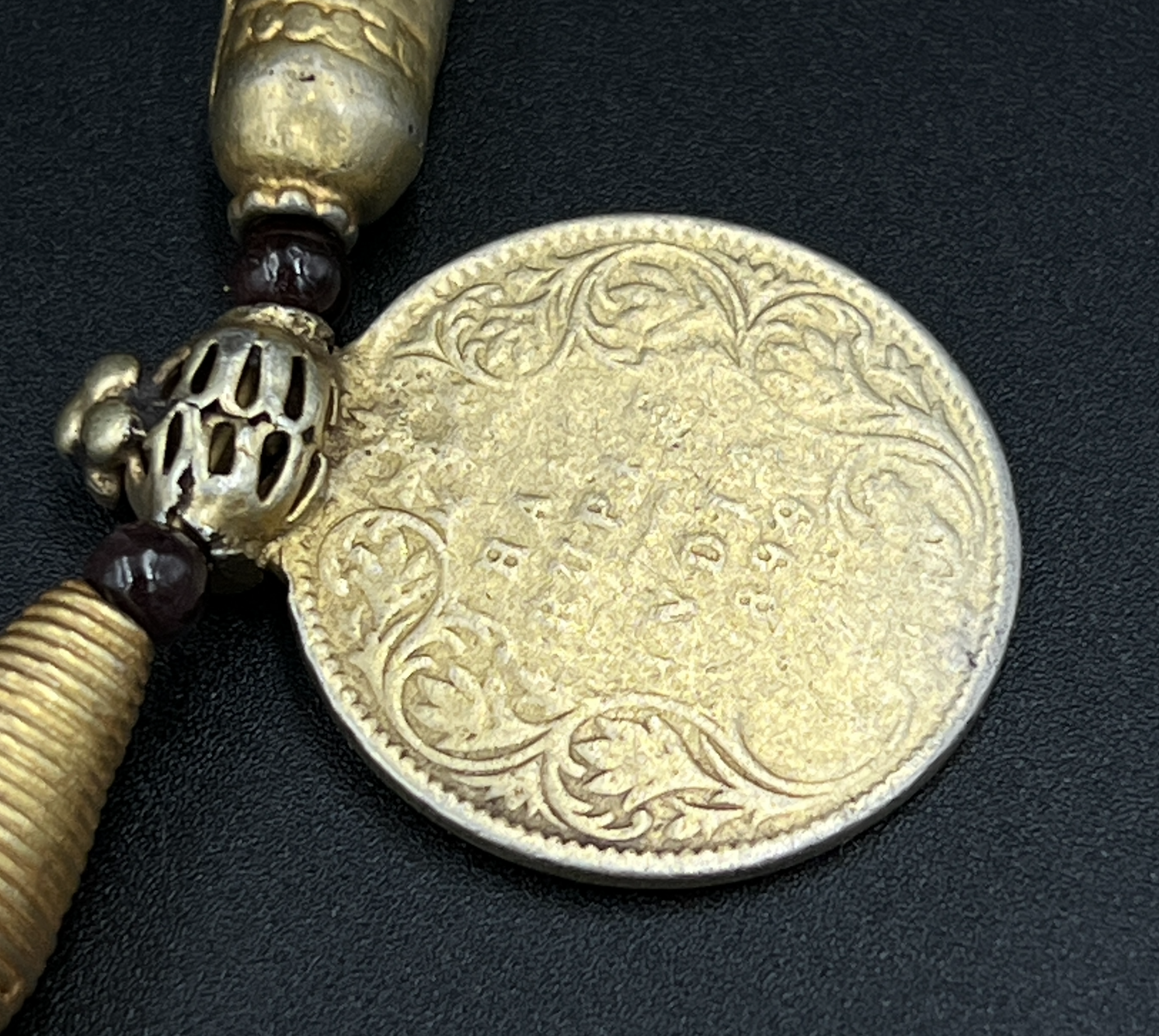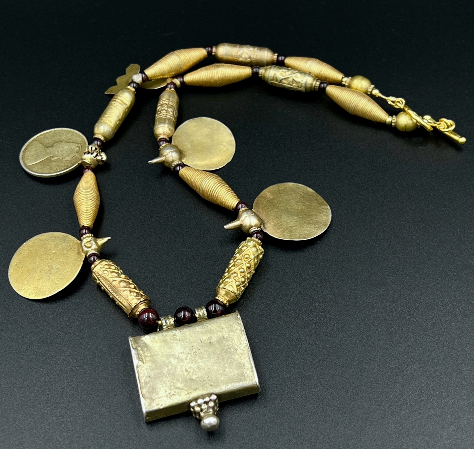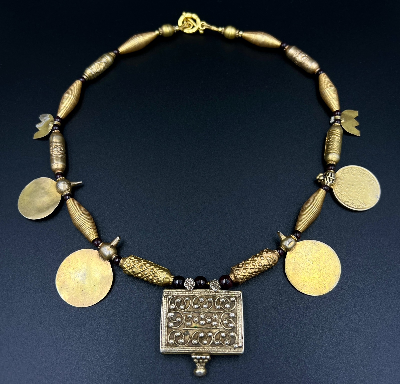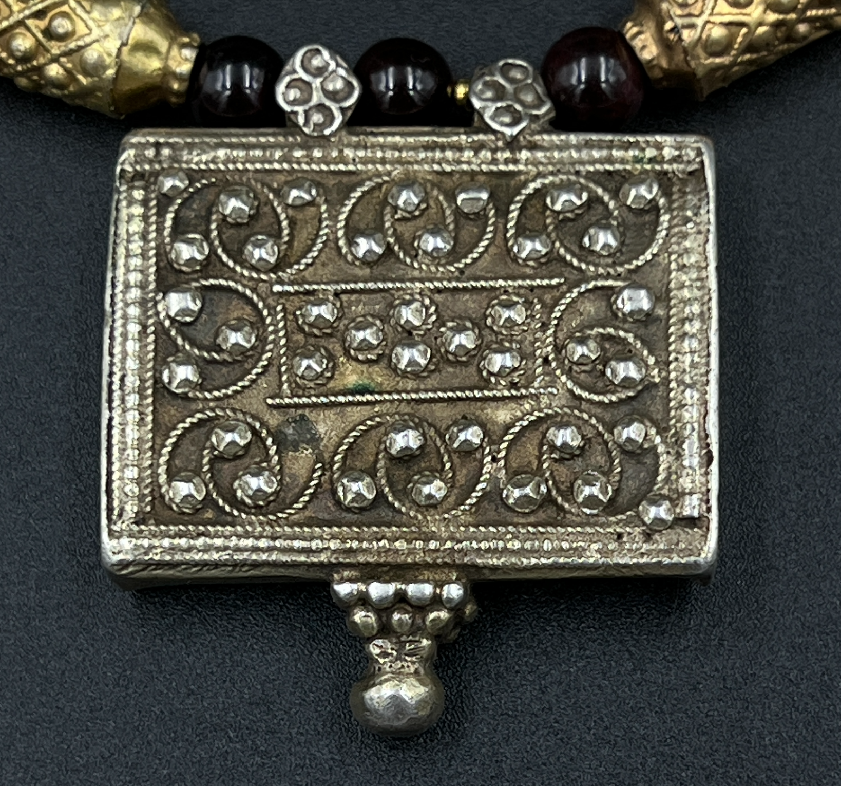 Spectacular set of antique beads from the 1800s, Yemen – washed gold and garnets. Central is an amuletic Koranic pendant. The hands are hamsas. Carefully designed by the International jewelry artist Savanna Storm. She is recognized worldwide. Weight: 58gms Length: 19inches/48cms Gold washed Indian Rupee coin dated 1899, with Yemen filigree bail added to it. This garnets and gilt necklace was recently reassembled from old and antique Yemen gilt on silver beads, dating from late 1800’s to early 1900s. It’s made from pieces collected from broken traditional necklaces from the Mahra region of Yemen. It’s rethreaded with Indian garnets, and a recently made gold washed clasp from Bali. The coins represent wealth, the little hand shaped pendant could represent a good luck charm or hamsa, which were used as decoration on a Yemen bridal headdress. There is the whimsical addition of an old Indian Rupee. Beads like the granulated barrel shapes are seen in Marjorie Ransom’s book Silver Treasures from the Land of Sheba. Yemen, located on the south west point of the Arabian peninsula, and it’s proximity to Africa on the other side of the Red Sea, has for millennia been a significant trade route. It’s agricultural riches and location brought wealth, education and culture, resulting in it being the seat of kingdoms and empires. The legend of the Queen of Sheba originated when she arrived at King Solomon’s palace heavily adorned in gold jewellery. The area is rich is precious minerals and archeological research has shown that gold was mined and worked around al-Maraziq as early as 1000BC. Silver mines were in operation from around 10th century CE. Yemen’s traditional silver jewellery is intricate and artistic. Many of the Yemeni silversmiths were Jewish, who became famous for their skills that they passed down the generations. Many of their works were signed by the craftsman, which was a form of quality control and authentication. Each region had its own style, but shared their heritage. On the Red Sea coast, the jewellery resembles that crafted on the African coast on the opposite side. Towards the east there are Omani and Indian influences. Inland, jewellery shares its forms and shapes with Saudi Arabia. It’s often quite difficult to tell exactly which region Yemen jewellery comes from, but what all the regions have in common is a unique, recognisable style made with great skill. Although the Yemeni preferred gold jewellery to silver, not everyone could afford it. To make it look gold, the Yemeni craftsmen dipped their silver jewellery into a mixture of gold powder mixed with acid and water, which produced a light gold wash. But the Mahris softened gold to powder and mixed it with mercury, which was then applied to 83 percent silver, resulting in a gold wash that lasts much longer than other techniques.