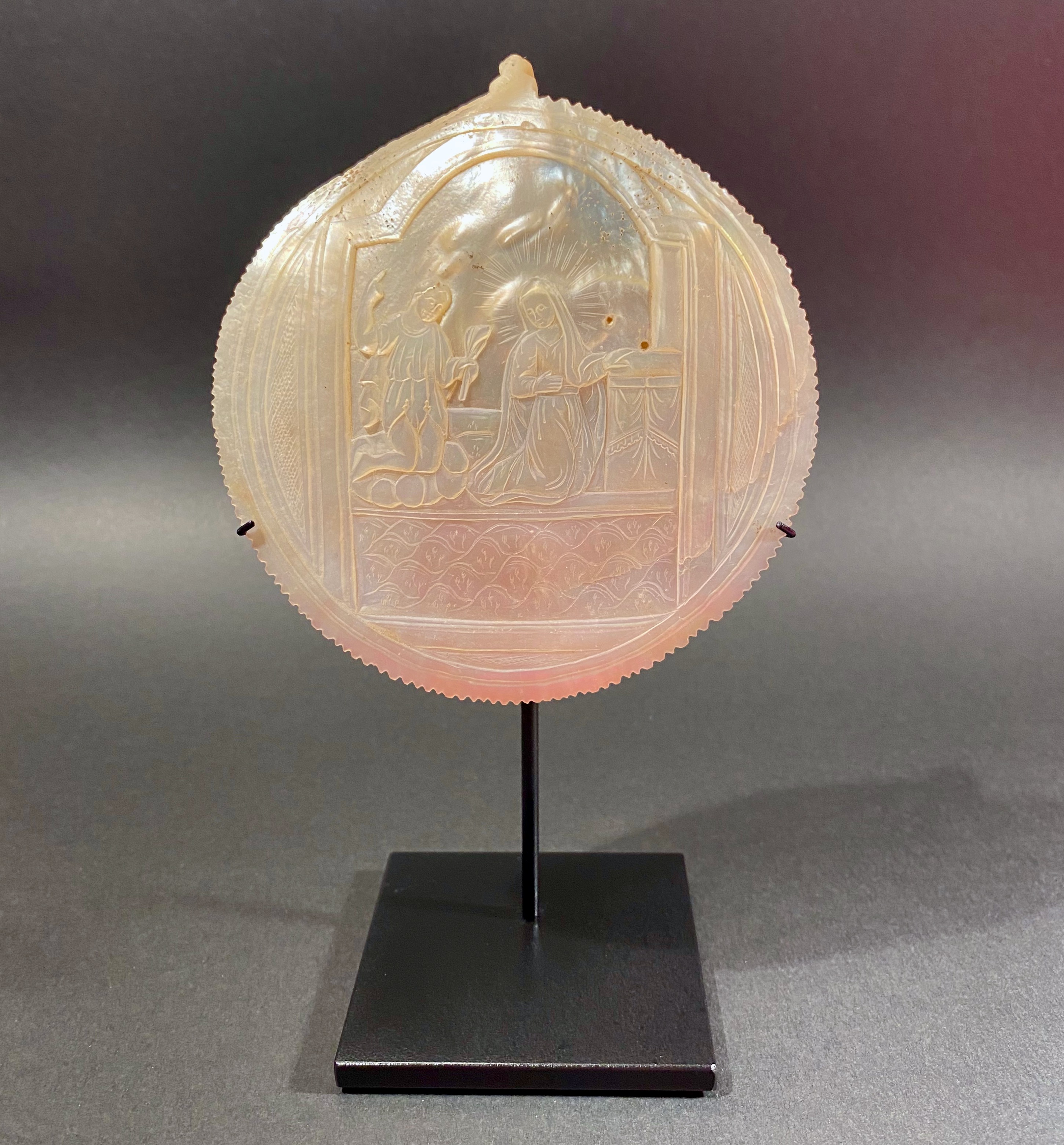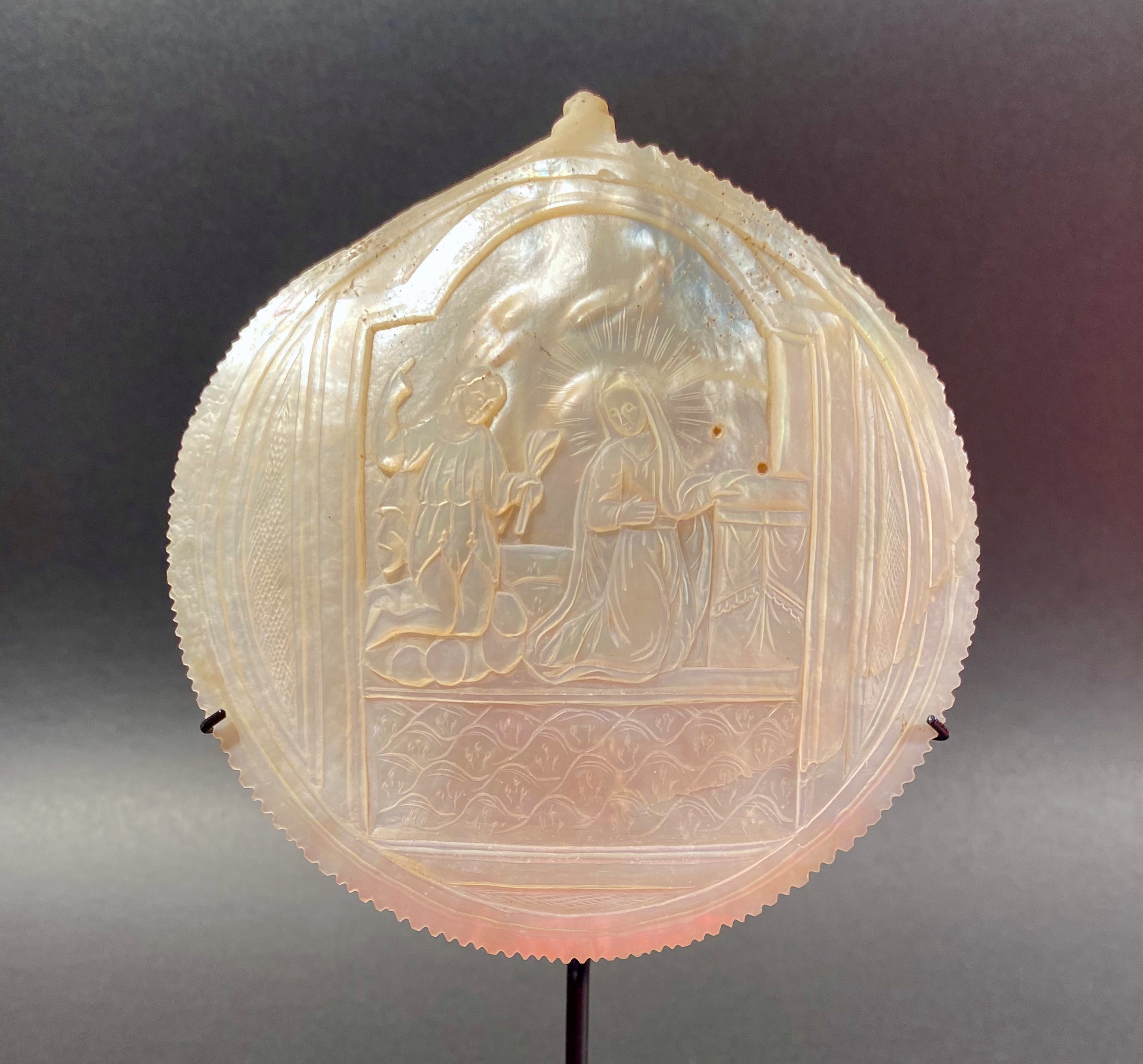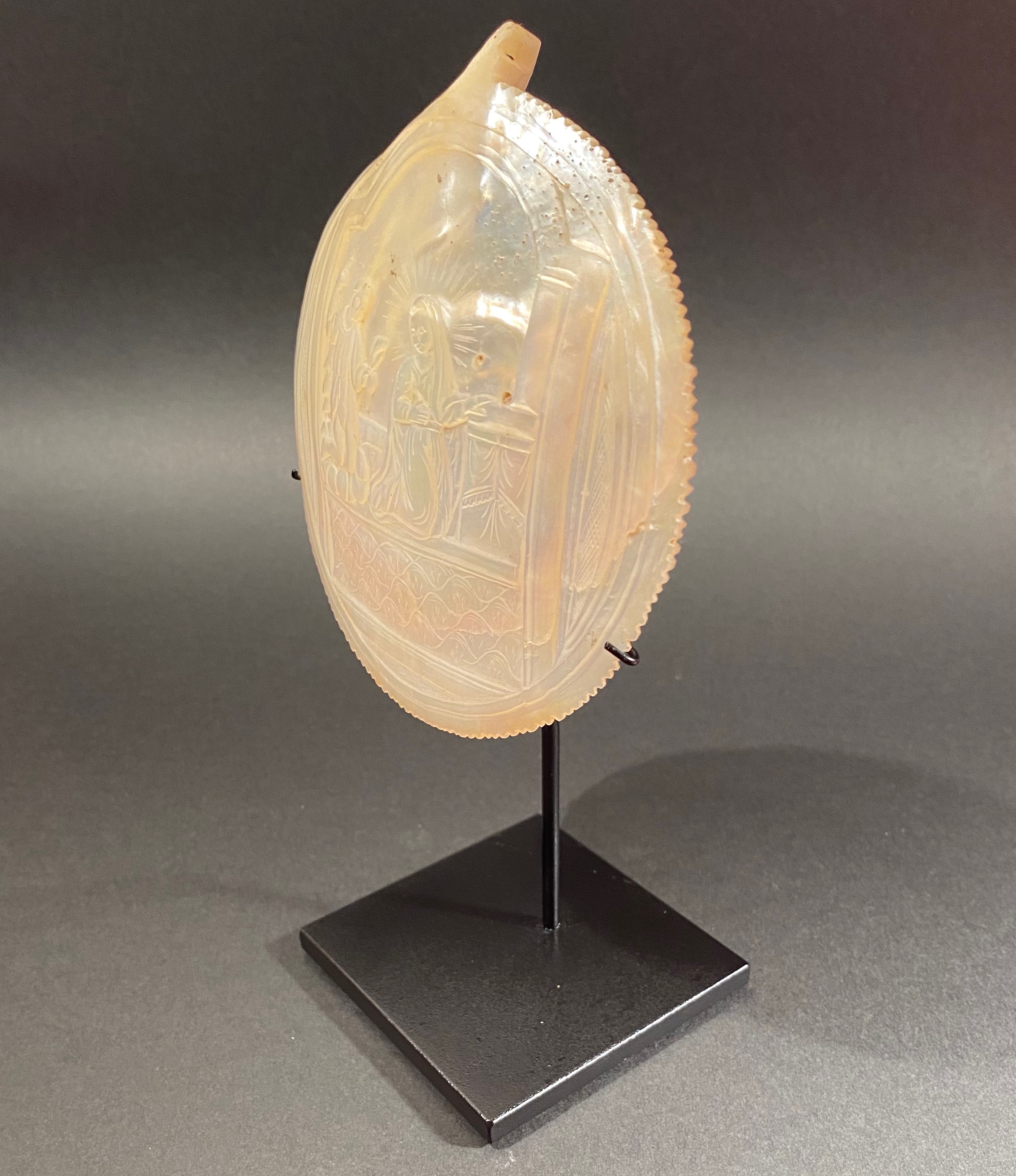 Beautifully hand-carved late 18th-century Antique Seashell mother-of-pearl Religious Relic ceremonial Shrine object, designed with a contemporary display custom stand. A lot of this kind of handicraft work was made on ships to pass the time away. Religious handicraft art using natural materials such as hand-carved seashells has a long history dating back to ancient civilizations. Many cultures have used shells in religious and spiritual practices, often incorporating them into decorative items such as masks, jewelry, and altars. In some indigenous cultures, seashells were believed to have spiritual significance and were used in ceremonies and rituals. In Christianity, shells have been used as a symbol of pilgrimage, with the scallop shell being a common emblem of the Camino de Santiago. In recent times, religious handicraft art using natural materials such as seashells has become a popular form of folk art, with many artisans creating intricate and detailed pieces.