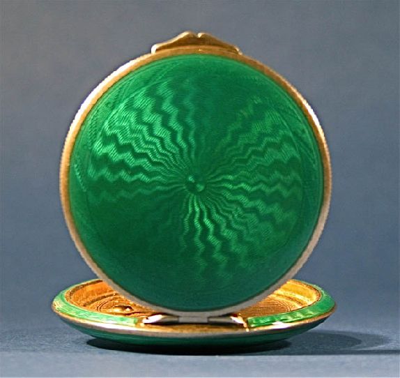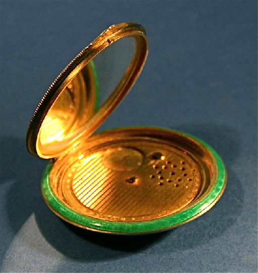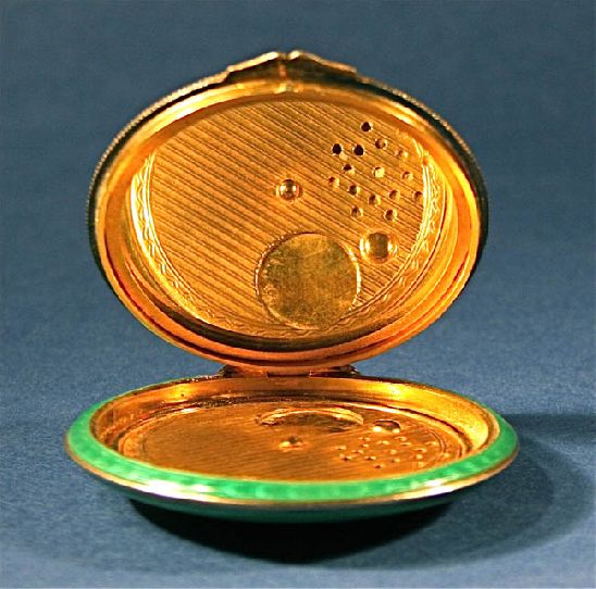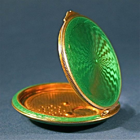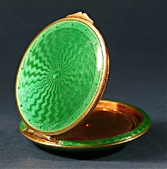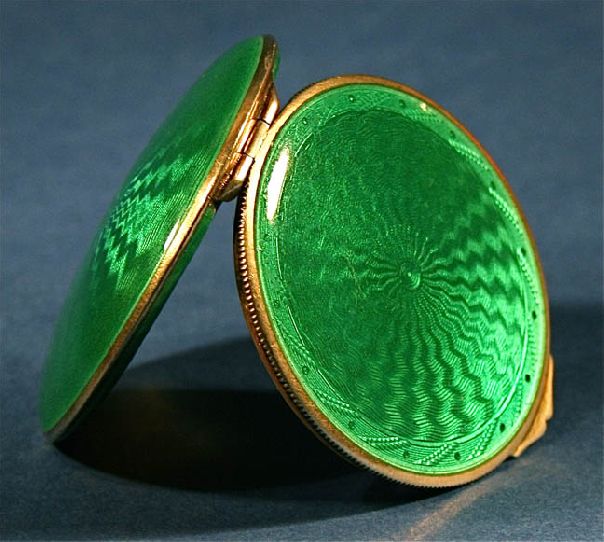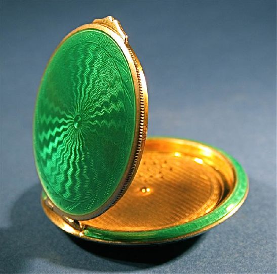 Title: Antique Sterling Silver Green Enamel Compact Make-Up Box
