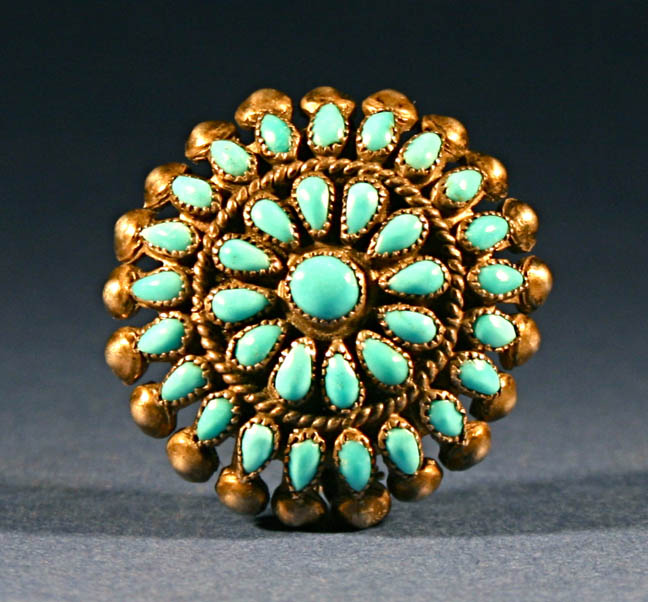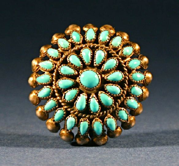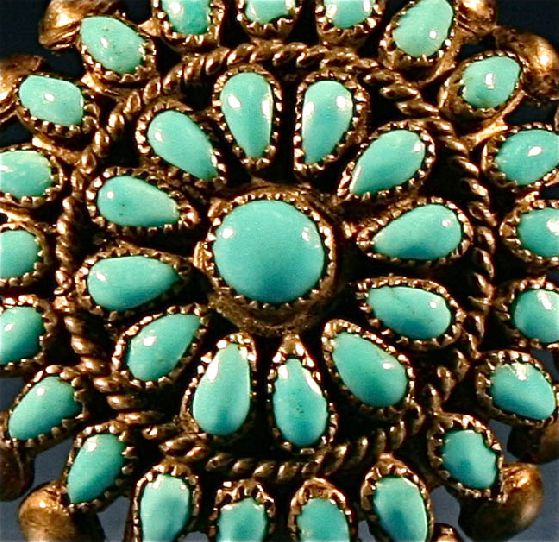 Little turquoise cluster pendant and pin combination may be worn either way. Sterling silver. Handcrafted Indian art. It looks to be Navajo. This looks to be from the 1930s to 1950s, Handmade Sterling Silver & Turquoise Indian Brooch. Mid-century modernism influenced this period with the use of abstract sprays of diamonds in mixed cuts, starbursts and “atomic” shapes. Textured gold dominated the decades with florentine finishes, foxtail chain, twisted rope, braided wire, mesh, reeding, fluting and piercing. Gold jewelry without gemstones was worn primarily in the daytime, with diamond jewelry for the evenings. Amethyst, turquoise, and coral were the favorite colored gemstones while cultured pearls were gaining acceptance into day wear.