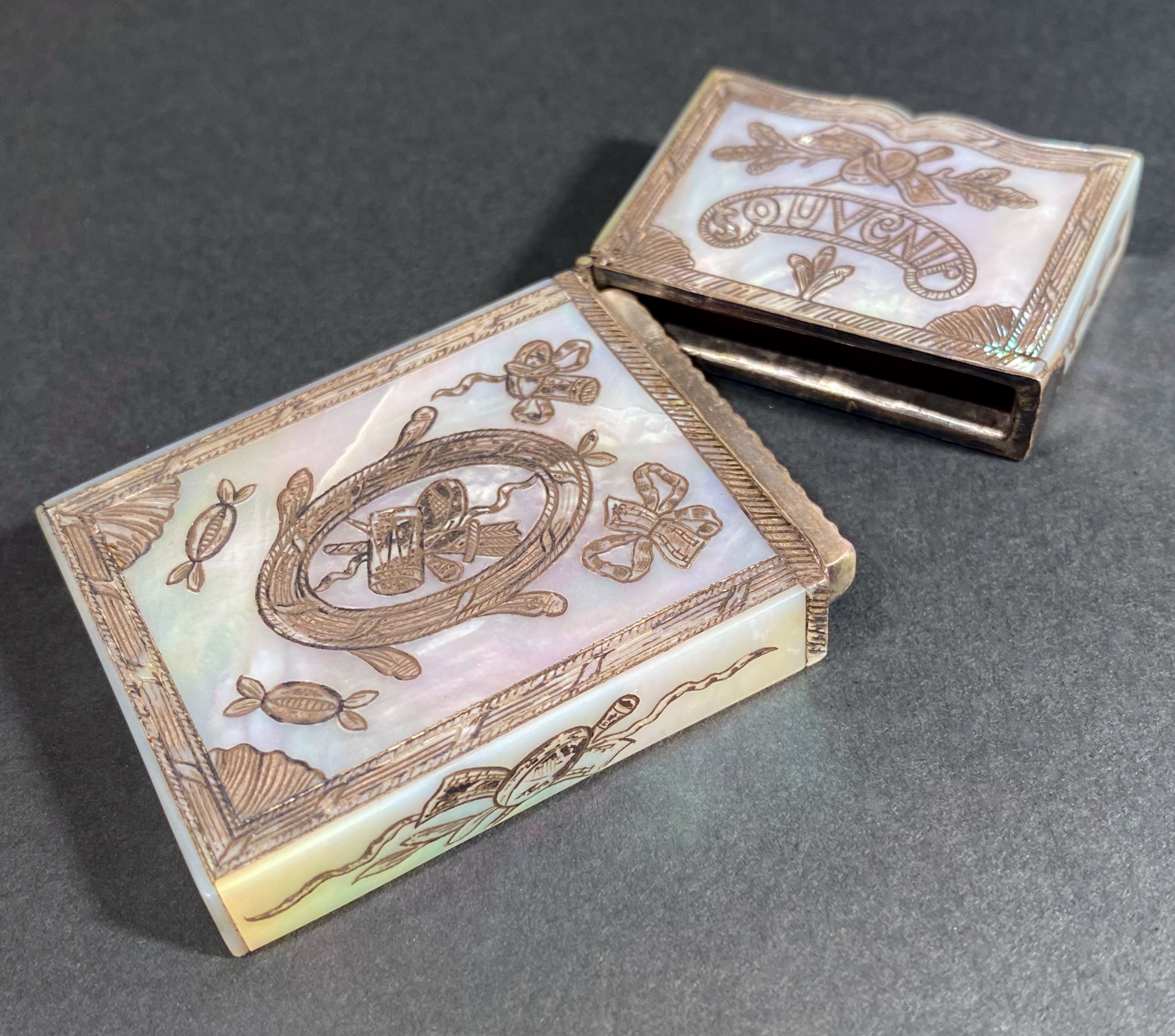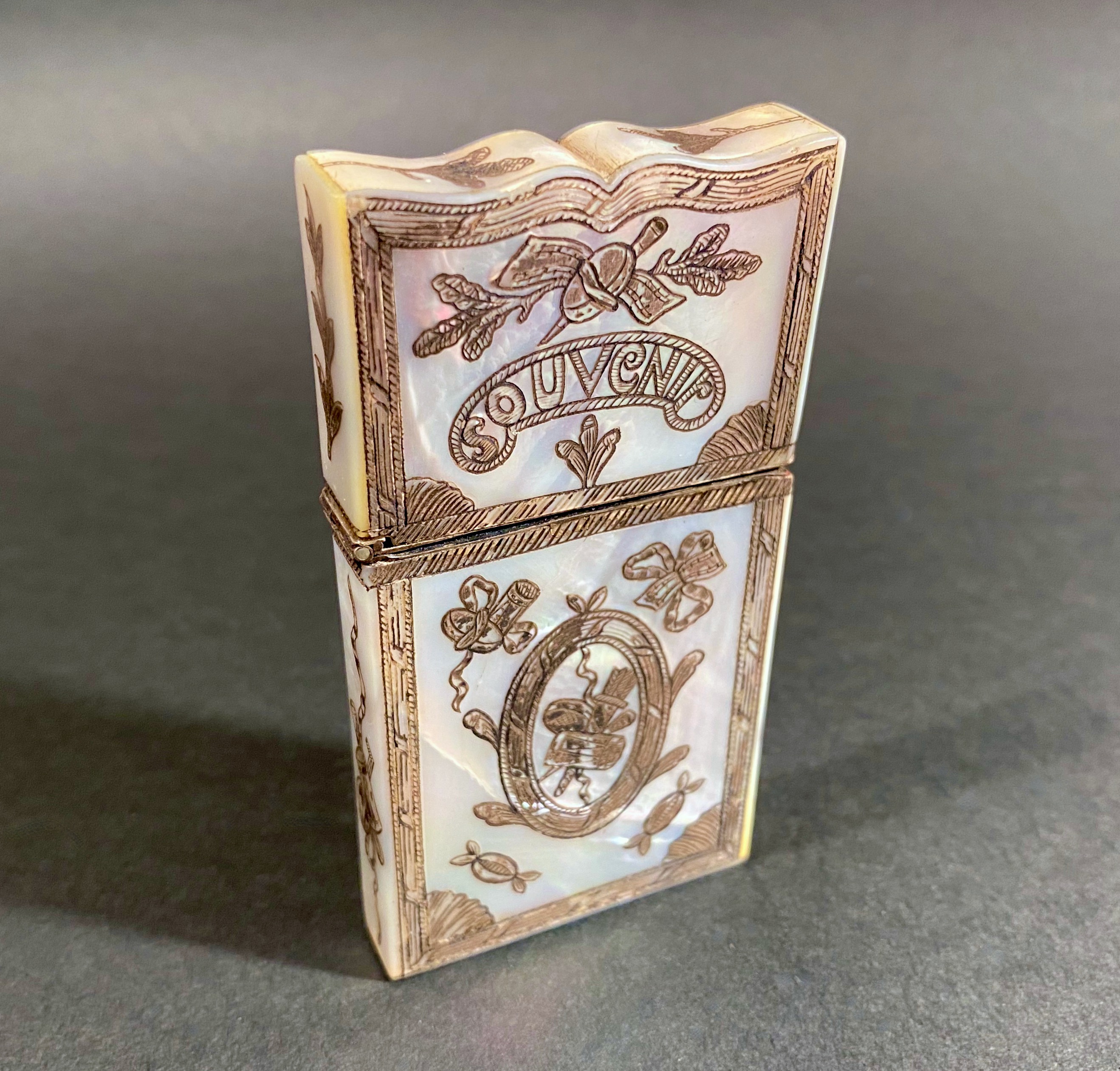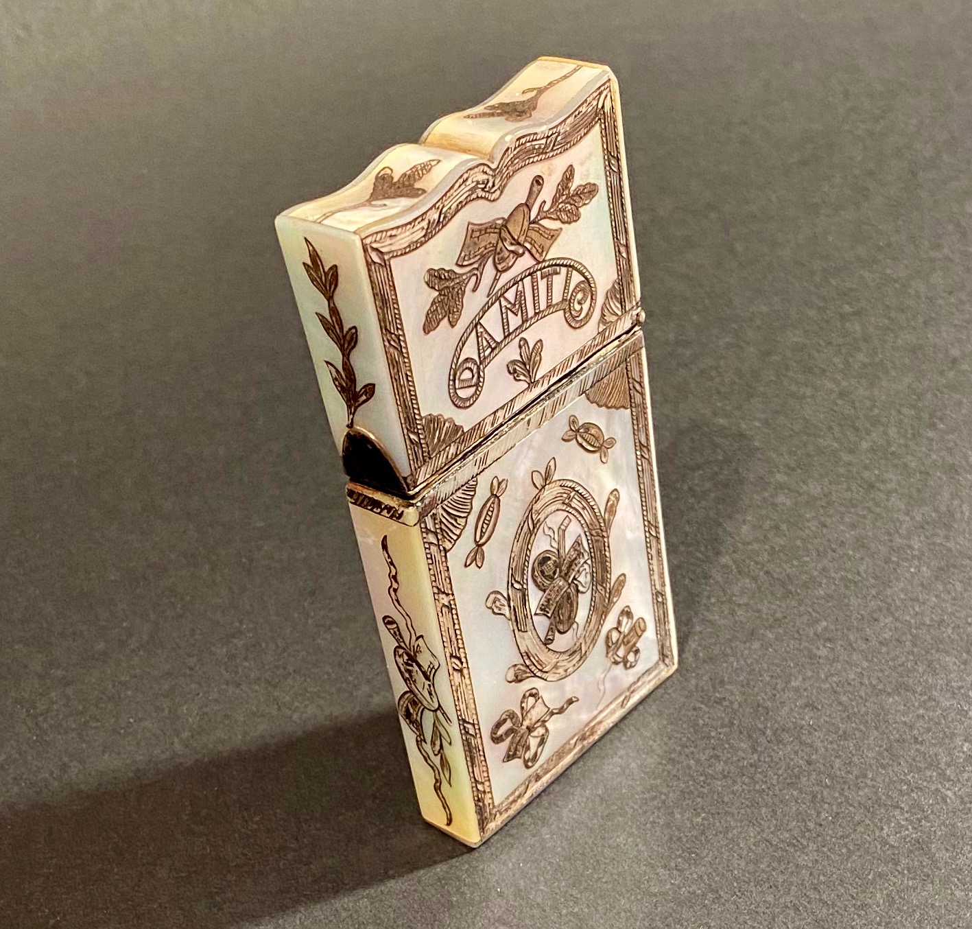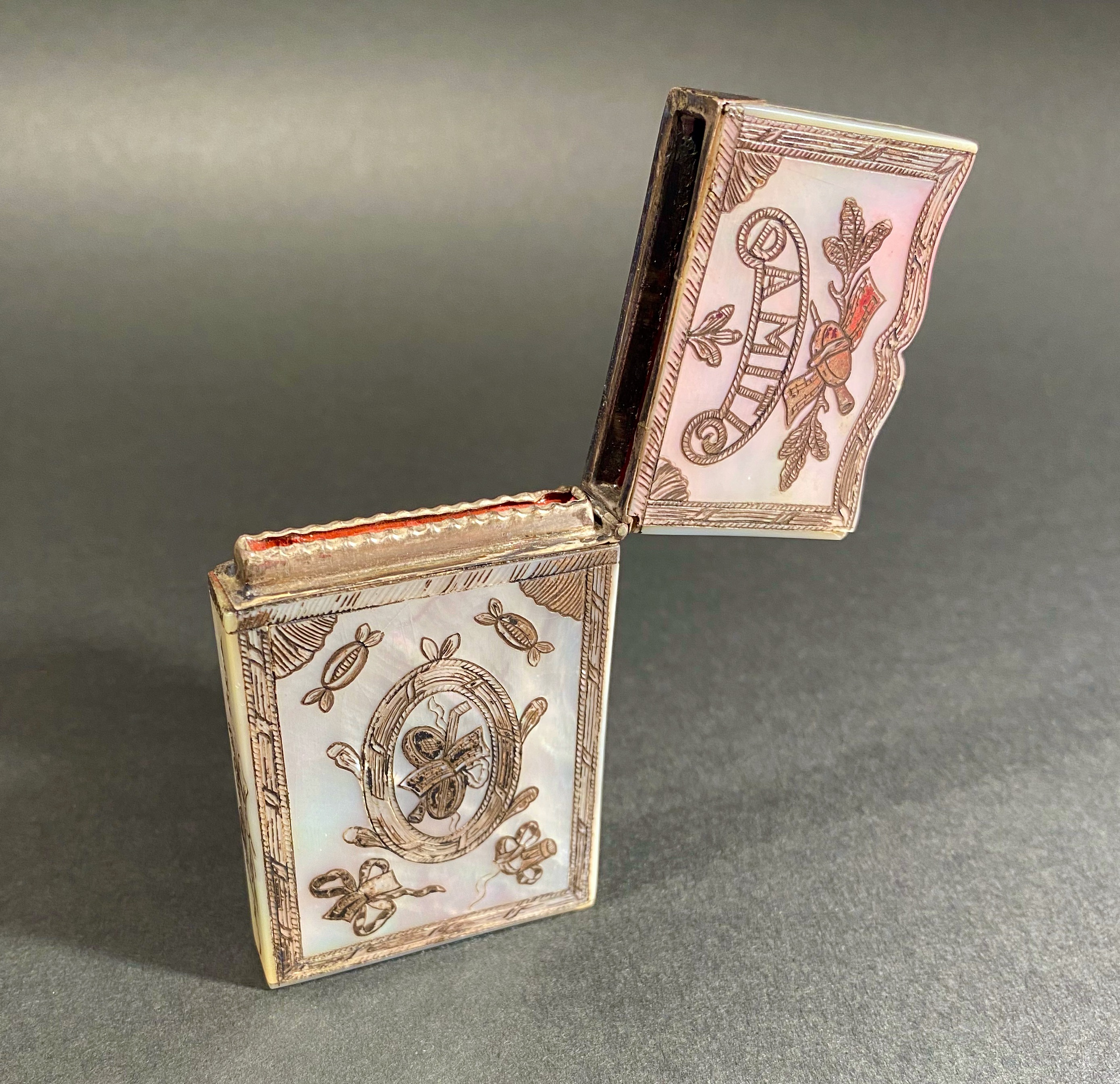 Title: Rare 19th-century mother-of-pearl engraved calling card box holder