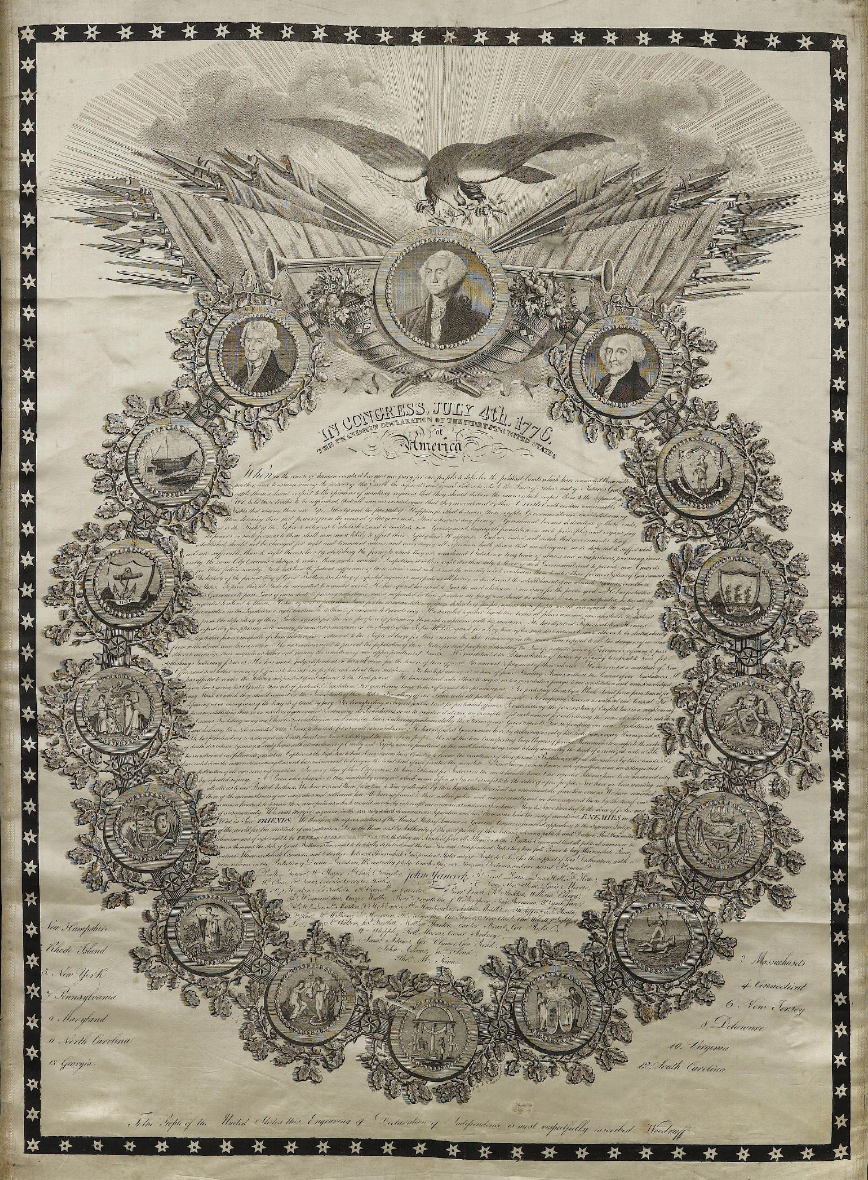 The Declaration of Independence: Printed, Painted, and Preserved The Declaration of Independence was first printed on July 4, 1776, in a format known as the Dunlap Broadside. This was a typeset version, the first official text distributed to the public, named after John Dunlap, the printer commissioned by the Continental Congress. Following the initial printing, several other printed versions were created. Among the most significant was the Stone Engraving, produced in 1823 by William J. Stone. This version is widely considered the most accurate copy of the original Declaration, incorporating a few minor corrections made during the drafting process. Handwritten and Painted Versions In addition to printed editions, several handwritten and painted versions of the Declaration were produced. The most famous is the engrossed copy, penned by Timothy Matlack, a clerk in the Pennsylvania State House, in July 1776. Written on parchment, it includes the signatures of the Continental Congress members who approved the document. Another iconic representation is the Trumbull painting, completed by John Trumbull in 1817. It depicts the presentation of the Declaration for signing and has become one of the most enduring images of American history. While many of these artistic or embellished renditions are not literal representations of the original text, they played a critical role in popularizing the document and symbolizing the nation's democratic ideals. Their beauty and symbolism helped reinforce the Declaration’s lasting importance in the American imagination. Nationalist Revival After the War of 1812 A resurgence of nationalism after the War of 1812 sparked the creation of numerous ceremonial copies of the Declaration. By this time, most of the original signers had passed away or were elderly, and renewed interest in the nation's founding documents was spreading. Among the most prominent engravings of this period were those by Benjamin Owen Tyler, John Binns, and William J. Stone. The Binns vs. Tyler Rivalry In 1816, Philadelphia publisher John Binns publicly announced his plan to publish a grand engraved edition of the Declaration of Independence, complete with facsimile signatures and elaborate design, which he intended to sell for $10 ($13 with color). His announcement inspired others—most notably Benjamin Owen Tyler—to attempt similar editions, igniting a public rivalry. Binns accused Tyler of stealing his idea and violating publishing customs, leading to a bitter feud in local newspapers. To complete his project, Binns sought official materials. At the request of Senator Jonathan Roberts of Pennsylvania, Secretary of State James Monroe sent Binns a copy of the Declaration. Binns also requested impressions of the U.S. coat of arms and various state seals. With these elements in hand, Binns assembled a team of artists and engravers. In 1818, while still developing his design, Binns submitted an unfinished proof to register the copyright. Binns’s Vision Binns described his envisioned engraving in great detail: “A splendid edition of the Declaration of Independence. The design, in imitation of bas-relief, will encircle the Declaration as a cordon of honor, surmounted by the arms of the United States. Beneath that will be a large medallion of General George Washington, supported by cornucopiae, and embellished with spears, flags, and other military trophies. On one side will be a portrait of John Hancock, and on the other, a portrait of Thomas Jefferson, the author of the Declaration…” The design also featured medallions of the thirteen states, tied with olive wreaths, along with imagery of America’s agricultural abundance—tobacco, indigo, cotton, and rice. Binns hired Mr. Vallance to engrave the facsimiles of the signatures, and made arrangements for the engraver to work in Washington, D.C., using the original document as a reference. Tyler Beats Binns to Market Despite Binns’s careful preparation, Tyler released his version first in 1818. He dedicated it to Thomas Jefferson and included an attestation of accuracy from acting Secretary of State Richard Rush, son of signer Benjamin Rush. Still determined, Binns continued working. In July 1819, he sent an unfinished proof to Jefferson requesting feedback and announcing his intent to dedicate the work to the American people rather than any individual. Jefferson never received the proof and offered no input. In September 1819, Binns also reached out to John Adams, expressing the engraving's value and purpose. Although Adams received the print, there’s no record of him providing any feedback. Completion of the Binns Engraving By November 1819—over three years after his initial proposal—Binns finally completed his 26″ x 36″ engraving at a cost of $9,000 (equivalent to approximately $200,000 today). To distinguish his work, Binns included a certificate from Secretary of State John Quincy Adams, affirming that the signatures were “exact imitations” of the originals and that the document was a correct copy of the original housed in the Department of State. Binns also credited his collaborators: George Bridport – ornamental design Thomas Sully – arms of the U.S. and state medallions James Barton Longacre – engraved portraits Tanner, Vallance, Kearny & Co. – engraved the signatures James Porter – printer The portraits of Washington, Jefferson, and Hancock were copied from original works by Gilbert Stuart, Bass Otis, and John Singleton Copley, respectively. Approximately 100 copies of the Binns engraving are estimated to survive today. One copy, from the records of the U.S. Senate, is housed in the Center for Legislative Archives at the National Archives. The Stone Engraving and Official Recognition While the Binns and Tyler engravings were impressive, they were not full, literal facsimiles of the original document. Their popularity declined when John Quincy Adams, then Secretary of State, commissioned William J. St