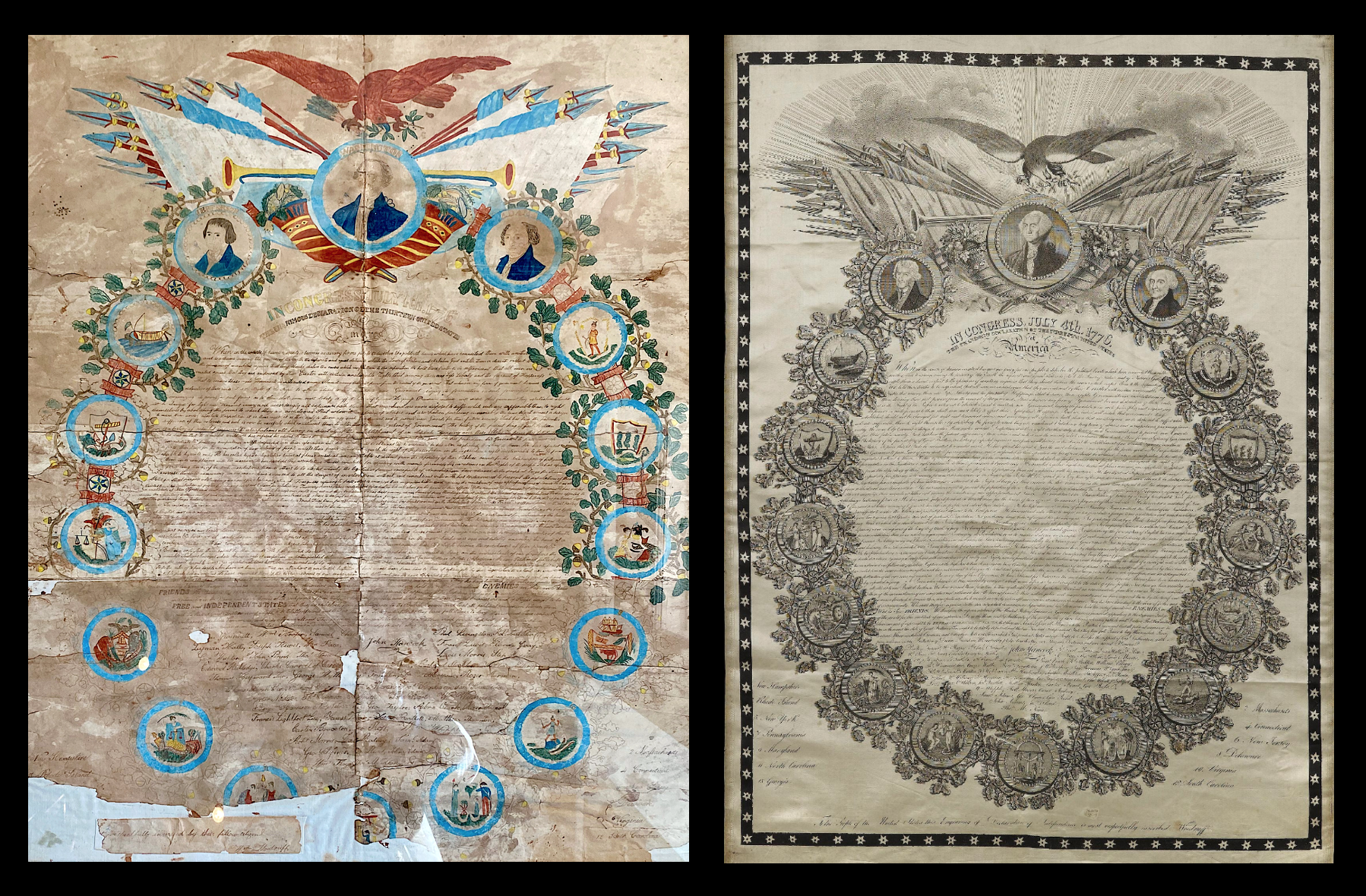 A Remarkable Historical Discovery: An Early Hand-Painted Declaration of Independence. This is an extraordinary find—an original, hand-painted and handwritten depiction of the Declaration of Independence on calfskin vellum. The design bears a strong resemblance to the 1819 engraving by artist William Woodruff, and we believe this painting may have served as the concept design and illustrative guide for that very engraving. The engraved version, published in 1820, is among the earliest printings of the Declaration ever made available to the American public. The original painting, recently discovered, is a gouache work featuring a red eagle clutching an olive branch and arrows. It includes portraits of George Washington, Thomas Jefferson, and John Adams, as well as the seals of the thirteen original colonies enclosed in an oak wreath and topped with an eagle. The text and signatures of the Declaration’s founding fathers are also meticulously represented. This painting appears to be an original color illustration created for the purpose of being reproduced as a broadside print in New York by William Woodruff. The artwork beautifully depicts the armorial bearings of the original thirteen states and the aforementioned presidential portraits. Executed on calfskin vellum and mounted onto what seems to be canvas cloth, the piece appears to have been framed in the 1950s and is currently housed behind glass. The document shows signs of folding and fragility, and has not yet been examined outside the frame. We believe it was created as a formal, artistic prototype for subsequent printed editions. Historical Context and Artistic Intent It is widely believed that an original design must have existed for Woodruff’s engraving to take form. Such a detailed layout could not have been conceptualized spontaneously. Logically, a preliminary sketch—followed by a colored rendering—would have been necessary to guide the engraver in interpreting the final composition. This painting, therefore, may represent that rare and critical step in the process, making it a significant piece of American folk art. About the Gouache Technique Gouache painting is a method that uses opaque watercolors, composed of pigment, water, and a binding agent such as gum arabic. Thicker and more opaque than traditional watercolors, gouache produces rich, flat color areas and allows for sharp detail. It has long been favored for illustrations and miniatures due to its precision. During the 18th and 19th centuries, gouache techniques closely resembled those used today, though materials varied. Artists employed natural pigments like vermilion, indigo, and ultramarine, mixed with binders to create a smooth surface. "Bodycolor"—a technique involving white pigment—was sometimes added to enhance opacity. Gouache was often used in tandem with watercolor for complex visual effects and remained popular for its vivid coloration and fine detailing. The Document’s Role in the American Revolution This document—an original, painted and handwritten version of the Declaration—is a newly discovered artifact from a private estate. Though in poor condition, restoration efforts are being planned. Its creation likely served a ceremonial or symbolic purpose. The Declaration itself was the revolutionaries’ mission statement—a statement of principles to justify their cause and solidify their accountability. The use of vellum was deliberate: it’s a durable material capable of withstanding repeated handling, rolling, and transport. This was essential, as the Continental Congress carried the Declaration to various locations during the Revolutionary War. The document's formality was intended to convey the gravity of their undertaking. Although most Americans at the time encountered the Declaration through typeset "Dunlap broadsides" printed on July 4, 1776, this painted version represents one of several handwritten variations that reflect the evolving symbolism of the document. From practical press releases to elaborate artistic renderings, the Declaration's many forms reveal the growing importance it held in the American imagination. Historical and Cultural Value Handwritten and painted versions of the Declaration are rare and immensely valuable, both culturally and monetarily. The original engrossed copy resides in the National Archives in Washington, D.C., and is considered one of the nation’s most treasured documents. Other authentic handwritten copies—like the one purchased by television producer Norman Lear for $8.1 million in 2000—demonstrate their immense worth. Value is determined by condition, provenance, historical context, and rarity. These artifacts serve not just as historical records, but as cultural touchstones—reminders of the ideals and sacrifices that shaped the United States. Woodruff vs. Binns: A Feud Over Authorship When William Woodruff released his version of the engraved Declaration in 1819, he was swiftly accused of plagiarism by fellow engraver John Binns. Binns alleged that Woodruff, once a journeyman to his employee George Murray, had stolen his design. Though Binns filed a lawsuit, it was ultimately dismissed. Ironically, the controversy only heightened public interest in both prints. In 1816, Binns had announced plans to publish “a splendid and correct copy” of the Declaration, surrounded by the arms of the thirteen states and the United States, complete with facsimile signatures. For many Americans—who had never even seen the Declaration’s full text—this was their first opportunity to encounter it as a national symbol rather than a wartime document. While Binns worked to prepare his print, Woodruff released his own version in February 1819—months before Binns’ October/November publication. The two prints were visually similar, sparking the lawsuit that led to the 1821 court case Binns v. Woodruff. Supreme Court Justice Bushrod Washington ruled that copyright law protected either the full