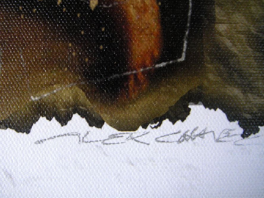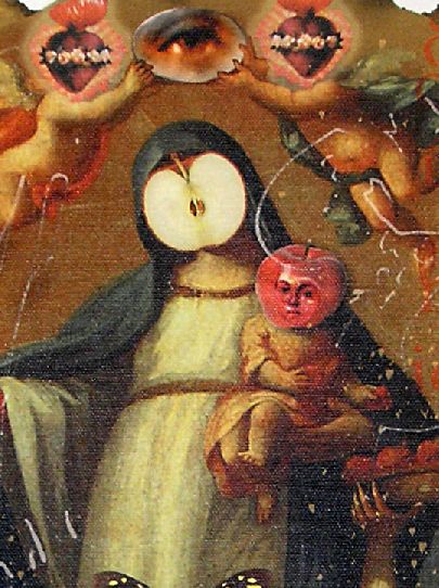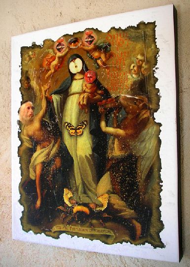Crown of Creation by Alex Chavez is a smaller (16x20 inch) Hand Embellished canvas print. This particular piece is an artist proof one of the first ever made and the only one at this size. I create these outside of the normal micro limited edition of 6. Artist Proofs are preliminary works that lead up to the larger canvases. All included micro edition and artists proofs together no more that 10 pieces will every be made. Each one uniquely hand embellished by me, the artist. I create my images by cutting, pasting, altering and recombining old paintings into mash-ups. Creating fantastic images of new myths, icons, saints and sinners, gods and goddesses for our modern times. They are composed as digital photomontage on stretched canvas. Then each image is hand embellished by the artist using acrylic paint, gold leaf, and traditional collage methods becoming unique, individual mixed media works of art. Each image is limited to only 6 canvases. I produce 10 to 12 images per year and they are available in the following editions: The Original 30x40 inch Canvas. Heavily Embellished by the artist using a variety of different paints, and traditional collage methods. Making this a unique One-of-a-Kind item. Only one of this quality & size is available. In addition to the original a micro edition of five 18x24 inch canvases are available. These are retouched by the artist himself with acrylic paint and corrected to his standards. A graduate of fine arts from California State University Fullerton, I've painted for most of my career. Using acrylic and watercolor to paint portraits and murals. Shortly after moving to Taos, New Mexico in 1997 I started working in collage and mixed media to accurately describe what I saw in my minds eye. My images are "Mash-ups". By recombining, cutting, pasting, and altering my images to create new myths, icons, saints and sinners, gods and goddesses for these modern times. Producing hand embellish limited editions on stretched canvas. Using acrylic paint, gold leaf, and traditional collage methods to create unique, fantastic individual works of art. Exhibitions National Look at the Day of the Dead - Self Help Graphics Los Angeles CA 1996 Taught Retablo Painting Workshop - Millicent Rogers Museum Taos, NM 1997 Visions of the Virgin - Big Sun Gallery Taos, NM 1998 La Santa Cruz - Big Sun Gallery Taos, NM 1998 Mother Father Child - Big Sun Gallery Taos, NM 1998 Santo's y Diablos Show - Stables Gallery 1999 Works on Paper - Stables Gallery 1999 The Best of Taos: No Boundaries, No Barriers - Taos, NM 2000 Intermediate 2001 - Santa Fe New Mexico 2001 Fall Arts Festival - Taos, NM 2003 First Annual Taos Digital Art Show - Taos NM 2007 University of Nebraska - Digital Art Show - 2007 New Mex - Now Mix, National Hispanic Cultural Center - Albuquerque, NM 2008 Beauty Inside - Surrealist Show, 105 Studios Downtown Albuquerque 2008 Arte de los Muertos - Bernallio, NM 2009 Taos Invites Taos - Taos, NM - 2009 Saints & Sinners - Kimo Gallery - Albuquerque, NM 2009 Go downtown Contemporary Arts Festival - Albuquerque, NM 2003-2009 Annual Contemporary Hispanic Market - Santa Fe NM 2004-2009 Scary a group show at the Jennie Cooley Gallery Santa Fe, NM 2009 The Dark Side group show 105 Studios Albuquerque, NM Los Angeles Center for Digital Art, international "Top 40" show, 2010 Artaq the first International Competition of Urban Artists (Traveling Exhibit) Paris, Berlin, Brussels, Lyons 2010-11 & 2011-12 Emerging Artist - Limner Gallery Hudson, New York 2011 Recombinant ART - A Solo Exhibit at the 105 Art Gallery Albuquerque, NM 2011 Awards Award of Merit, Illustrator West 20 - Los Angeles CA 1992 Honorable Mention, Albuquerque State Fair 1997 Best of Show, Taos County Fair 1998 Macworld National Tour of 12 Digital Artist 1999 Best of Digital Art, Contemporary Hispanic Market - Santa Fe NM 2004 Best of Digital/Photography, Contemporary Hispanic Market - Santa Fe NM 2005 Publications Illustrator West 20 1992 Tempo Taos New Mexico Arts & Entertainment Magazine 1998 Macworld Digital Artist Compendium 1999 Tempo Taos New Mexico Arts & Entertainment Magazine 1999 Popular Photography Digital Imaging Guide 2002 Albuquerque Alibi Weekly Arts & Entertainment Magazine 2002 Tempo Taos New Mexico Arts & Entertainment Magazine 2002 ABQarts Albuquerque Monthly Magazine of the Arts 2003 Pasatiempo Santa Fe New Mexico Arts & Entertainment Magazine 2005 Tempo Taos New Mexico Arts & Entertainment Magazine 2005 Pasatiempo Santa Fe New Mexico Arts & Entertainment Magazine 2009 IQ Albuquerque Weekly of the Arts & Entertainment` 2009 Pasatiempo Santa Fe New Mexico Arts & Entertainment Magazine 2010 Tempo Taos New Mexico Arts & Entertainment Magazine 2010 ARTAQ Bookzine 2010 Books “Newicons” self published book of 13 images and text by the artist. “Saints and Sinners” self published mini portfolio of 18 images. "Santero" The Recombinant Art of Alex Chavez Public Engagements Regular guest speaker, Art History Class, the University of New Mexico -Taos Acquisitions Museum of International Folk Art, Contemporary Latino Collection. Santa Fe, NM National Hispanic Cultural Center, Permanent Collection - Albuquerque , NM Production Set of "Breaking Bad" an original AMC television series