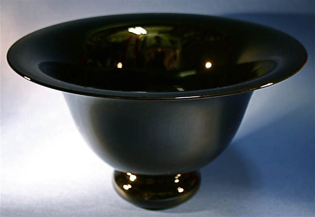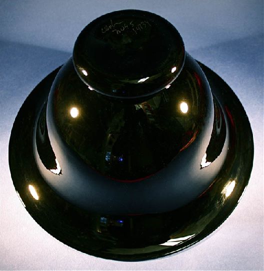 A Very Functional Contemporary Glass Bowl Design: This is a black hand blown bowl with foot. Possibly one of the great glass makers, it is hand signed and numbered by the artist. This bowl is a luxurious contemporary glass bowl, hand blown and tinted black color. The Bowl is a simple modern design which will adapt well to many decors. Find unique and affordable glass for all seasons. Weddings and home decor.