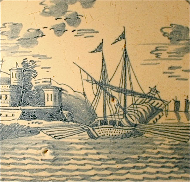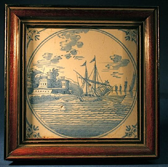 Art design decorative glazed painted blue tile made around 1650. Ship landscape tile. The period from 1650 to 1700 Since 1900 the tile raw material was made as a rule on a tile press. So that's why they have sometimes grooves at the back. Should the tile back produced with such grooves, beside a comparison between the colours of the burned clay, tiles of the 20th century can easily distinguish from tiles produced before 1900.