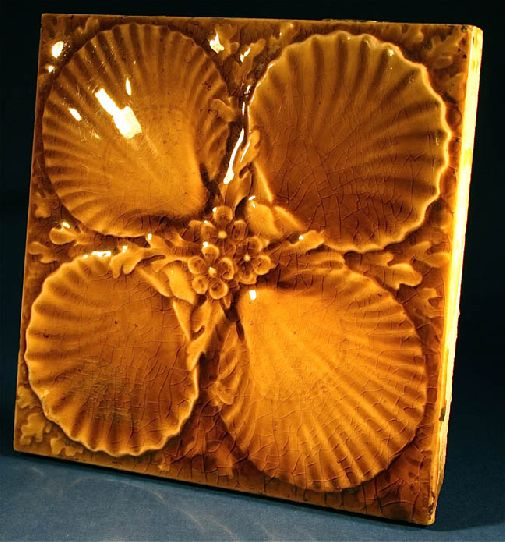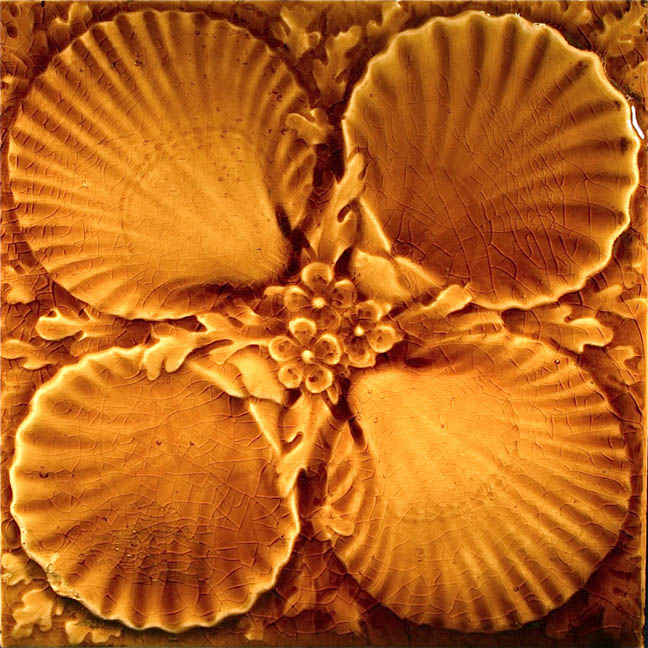 This is a relief moulded dust pressed tile with a fourfold shell neo-classical fan design, with a beautiful dark yellow glaze. Art deco design line and glazed dust-pressed tile with four stylized shells radiating from a central design. Yellow tile with a gorgeous glaze over the design. 6" square, 1920s or 1930s. Wonderful Art Tile! I was so taken by the design and quality. An Art Deco semi-relief yellow ground tile with four stylized shells. Condition: one or two very tiny edge nicks; light surface wear; nothing further found - if you have any questions about this item, contact us.