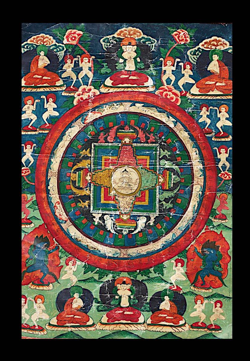Sino-Tibetan Bodhisattva Avalokiteshvara Thangka 15 ½" x 11" original image Of rectangular form silk Thangka, the central hand-painted image was stitched with several textile and silk borders, with a rod and a string for hanging at the top; depicting a central mandala with Bodhisattva Avalokiteshvara, surrounded by multiple figural groups in the sky and on earth in various postures, dark blue background on the upper half, grass green background on the lower half. Red wax seal and Tibetan stamp on the verso of the painting; later borders canvas stamped with additional info on the back lower right, overall 31-½" x 20 ¾". Thangkas were often unrolled and pinned up in a smoky and damp environment in temples, shrines, and homes, or carried in festivals causing the typical loss of pigments, creasing, and soil. Natural mineral pigments and canvas prepared with Yak-hide glue were typical. Condition: As is, wear consistent with age and use. It comes unframed.