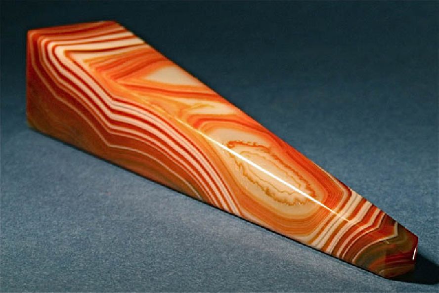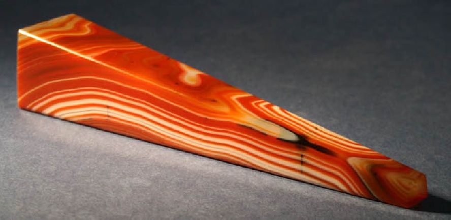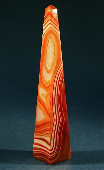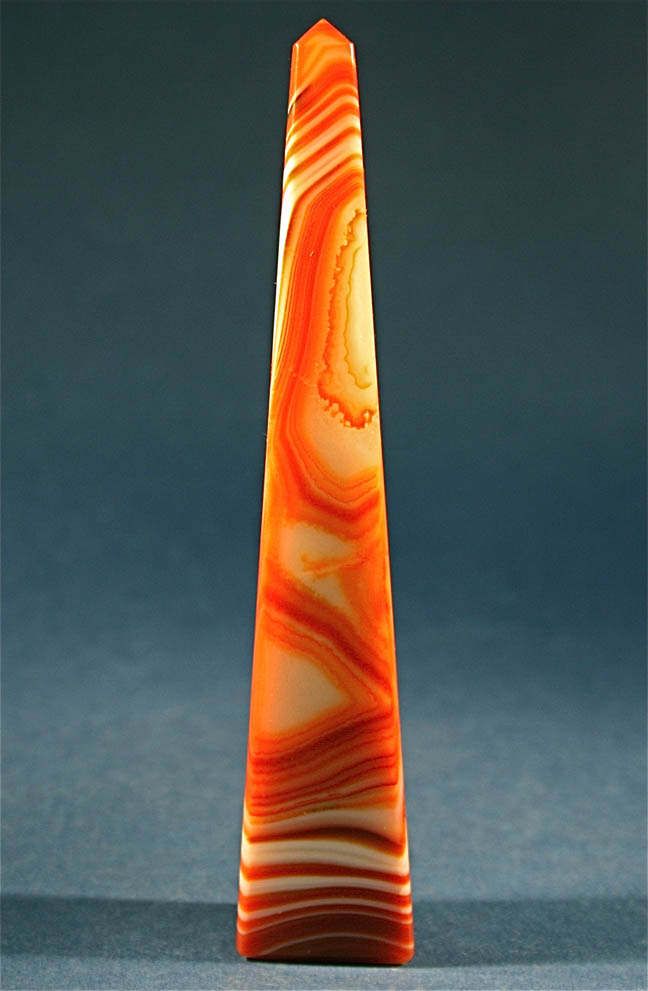 This is a very colorful beautifully banded red and white agate obelisk. This remarkable and extravagantly modeled stone has been used to make specialty objects de virtue for thousands of years. This pair of obleisk is nicely matched and gives the full range of the materials qualities. Often found in geode form this material is hard to get in large pieces Stone carving is an ancient activity where pieces of rough natural stone are shaped by the controlled removal of stone. Owing to the permanence of the material, evidence can be found that even the earliest societies indulged in some form of stone work. The oldest known works of representational art are stone carvings. Often marks carved into rock or petroglyphs will survive where painted work will not. Carving stone into sculpture is an activity older than civilization itself.