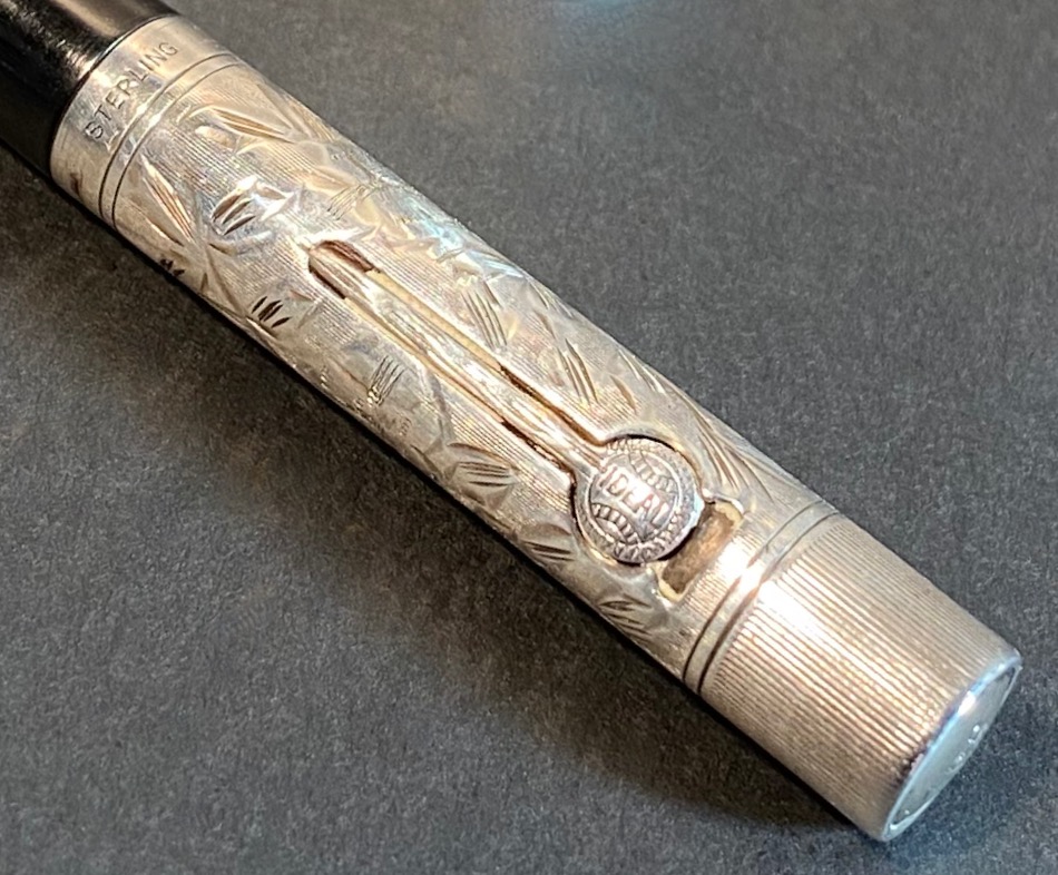 This is a beautiful hand-engraved sterling silver antique luxury accessory fountain pen from the early 20th century, which is highly collectible. It features a gold nib and is marked Watermen's REG. U.S. PAT. OFF. Fountain Pen (U.S.A.) - Sterling Silver, Hand Engraved, Lever Filler. It is designed to be worn as a decorative piece of jewelry, hanging around the neck. The baseball logo design company Ideal 452 1/2V is marked on the end. The condition of the pen is excellent, and it measures 5 inches when laid end to end. When the cap is screwed on, the size is 3 1/2 inches. Type Vintage lever-filling fountain pen. Product Name "452 1/2 V" (stamped on barrel end, small ring-top ladies' model). Manufacturer and Year Waterman, made in USA - 1920s Length 3-5/8", capped and not including the ring-top hardware. Filling System Lever filler. Color Fully engraved sterling silver cap and barrel with floral pattern. Nib FLEXIBLE FINE Waterman's Ideal New York gold nib is smooth with nice tipping. Almost full flex. Line variation from fine to a nice broad under very little pressure, and it varies to a larger broad with a little more pressure. Condition Excellent + condition. No significant wear to the silver; no dents, dings, ripples, pitting or corrosion; only slight scratches. No cracks, chips, or scratches in underlying black barrel/section pieces. No personalization. Waterman fountain pens have a rich history that dates back to the late 19th century. The company was founded by Lewis Edson Waterman, an insurance salesman who was frustrated with the unreliability of the fountain pens available at the time. In 1883, he invented the first practical fountain pen, which used a capillary feed system to regulate the flow of ink. Waterman's invention was a breakthrough in the world of writing instruments, as it allowed for a consistent and reliable flow of ink, without the need for frequent dipping or refilling. This innovation quickly caught on, and Waterman's fountain pens became highly popular in the United States and Europe. Over the years, Waterman continued to innovate and improve its fountain pens, introducing features such as the first retractable nib in 1905 and the first lever-filling mechanism in 1913. Waterman also became known for its stylish and elegant designs, which made its pens highly sought after as luxury accessories. During World War II, Waterman's factories were repurposed for military production, but the company bounced back after the war and continued to produce high-quality fountain pens for many decades. In the 1950s and 1960s, Waterman introduced several new models, including the "C/F" (Cartridge Fountain Pen) in 1953, which was the first fountain pen to use disposable ink cartridges. In the 1980s and 1990s, Waterman continued to innovate with new materials and designs, such as the "Man 100" fountain pen, which featured a solid gold nib and a unique, hexagonal shape. Today, Waterman is owned by the Newell Brands company, and its fountain pens remain popular among collectors and writing enthusiasts around the world.