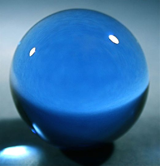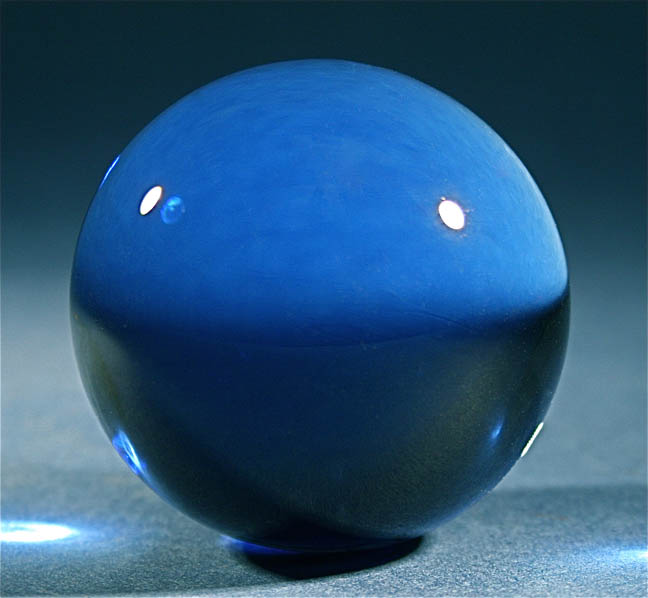 This is a beautiful and small crystal cobalt blue ball, This sphere is made by first crushing natural quartz into fine pieces, then melting it down into molten quartz glass. Then poured into molds and finally finished in traditional crystal ball methods. The melting process removes 99% of all impurities usually found in all natural quartz. Prominent in the Middle Ages, Scryers (Fortune Tellers) revered their crystal balls, often passing them on to their apprentices. Still used extensively today, and just as prized, the ball must be optically flawless.
