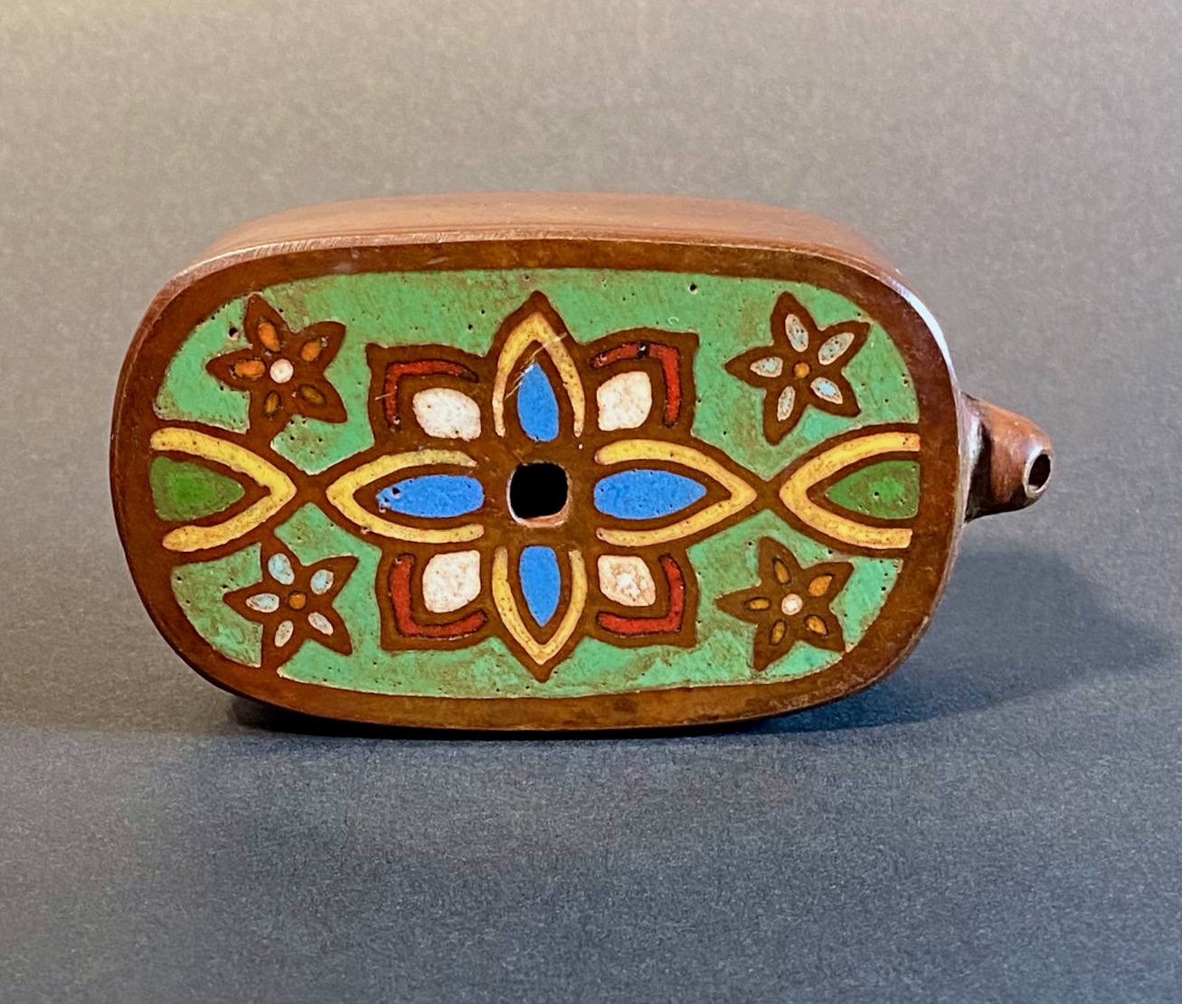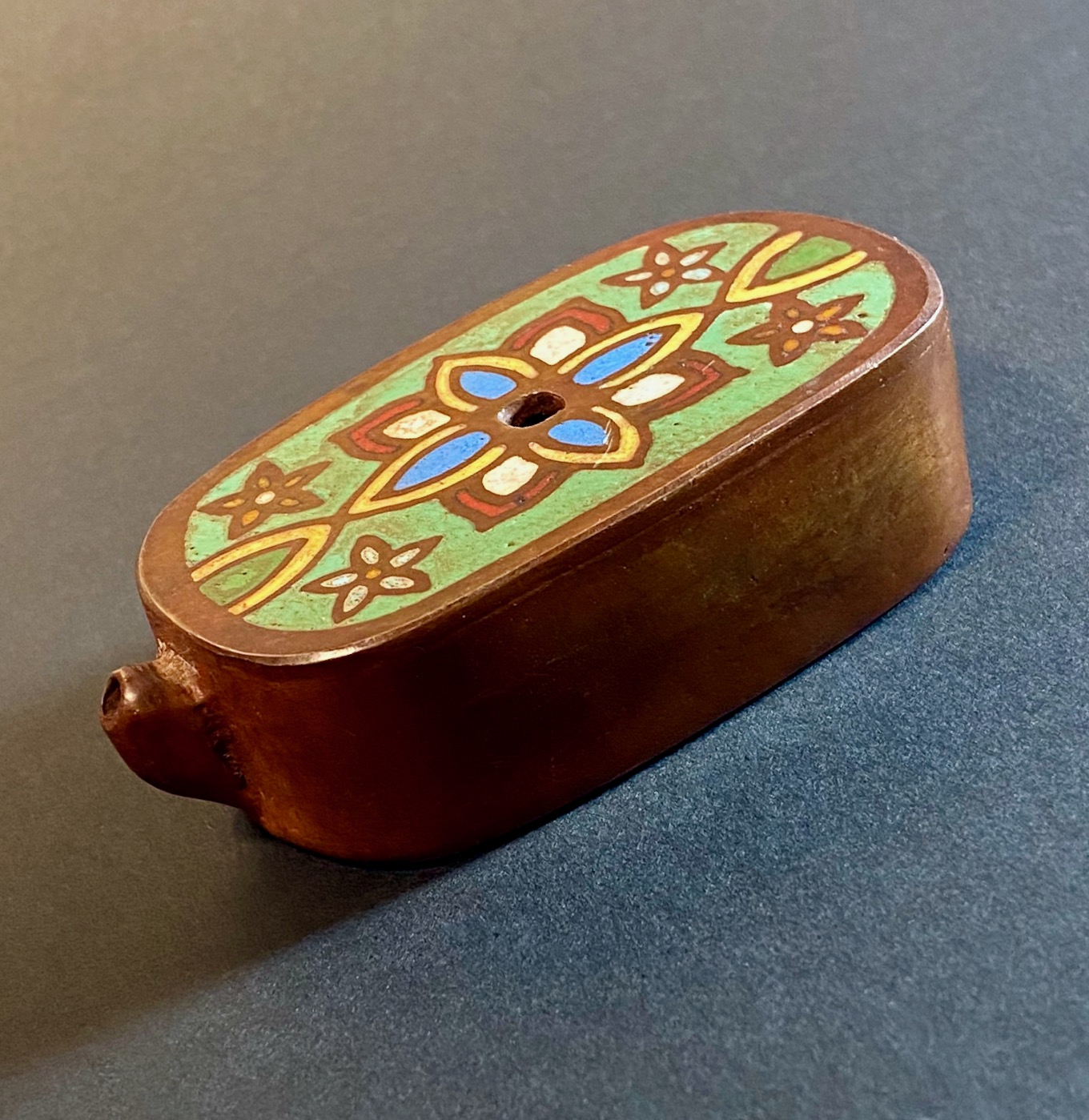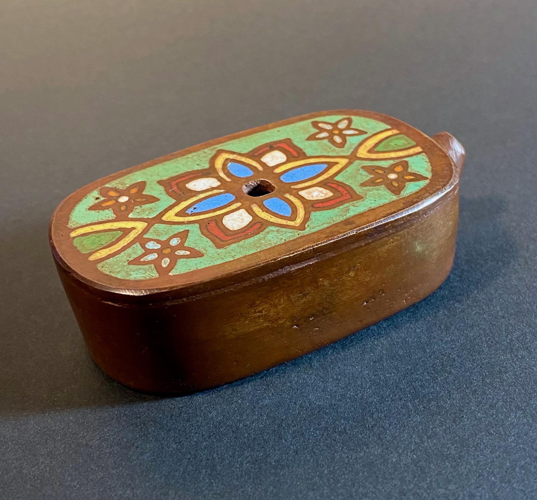 These amazing tools were used by Chinese calligraphers. Water dropper tools were used to make ink on a stone, which could then be mixed into the brush and applied to paper. You were looking at an antique enamel Cloisonné water dropper container, designed to be a part of a Japanese Sumi tray, ink well, and Sumi-brush washer. It was used specifically for painting and creating Chinese calligraphy and Oriental art. Dimension 3 inches long Heights 7/8 the width 1 1/2 inches