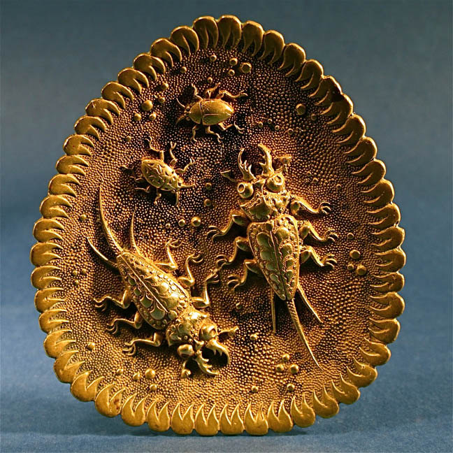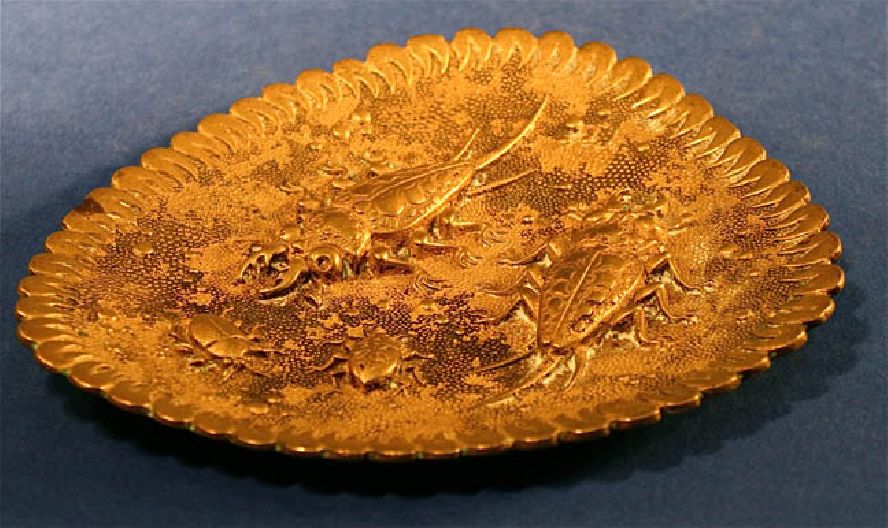 A wonderful antique rare brass dish, at least circa 1900. The bugs are lounging on a lotus leaf. It has a very Art Nouveau look but Victorians loved their nature inspired designs as well so if falls somewhere between those two time periods. Very detailed and in perfect condition. Elaborate and fascinating embossed oval brass plaque or dish. The embossing represents a scene with bugs as the central focal point. Each directional point has an embossed design and four large bugs within. This dish is solid brass with some aged black patina. The embossing has amazing detail. This unique piece is very rare. There are no dings, bends, or repairs to this beautiful piece. It has nice detail and a nice patina. A truly unique looking piece for the high end collector!
