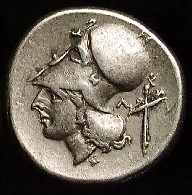 CORINTH TYPE AR STATER. EF. PEGASUS FLYING/ HEAD ATHENA WEARING CORINTHIAN HELMET. BETTER THAN PHOTO: CORINTHIAN TYPE STATER. EF. Surface better than image shows. In Greek religion and mythology, Athena or Athene, Athana), also referred to as Pallas Athena/Athene, is the goddess of wisdom, courage, inspiration, civilization, law and justice, just warfare, mathematics, strength, strategy, the arts, crafts, and skill. Minerva, Athena's Roman incarnation, embodies similar attributes. Athena is also a shrewd companion of heroes and is the goddess of heroic endeavour. She is the virgin patron of Athens. The Athenians built the Parthenon on the Acropolis of her namesake city, Athens (Athena Parthenos), in her honour. Athena's veneration as the patron of Athens seems to have existed from the earliest times, and was so persistent that archaic myths about her were recast to adapt to cultural changes. In her role as a protector of the city (polis), many people throughout the Greek world worshiped Athena as Athena Polias Athena of the city. The city of Athens and the goddess Athena essentially bear the same name, "Athenai" meaning "[many] Athenas". The Greek philosopher, Plato (429–347 BC), identified her with the Libyan deity Neith, the war goddess and huntress deity of the Egyptians since the ancient Pre-Dynastic period, who was also identified with weaving. This is sensible, as some Greeks identified Athena's birthplace, in certain mythological renditions, as being beside Libya's Triton River. Scholar Martin Bernal created the controversial "Black Athena Theory" to explain this associated origin by claiming that the conception of Neith was brought to Greece from Egypt, along with "an enormous number of features of civilization and culture in the third and second millennia. Classically, Athena is portrayed wearing a full- length chiton, and sometimes in armor, with her helmet raised high on the forehead to reveal the image of Nike.