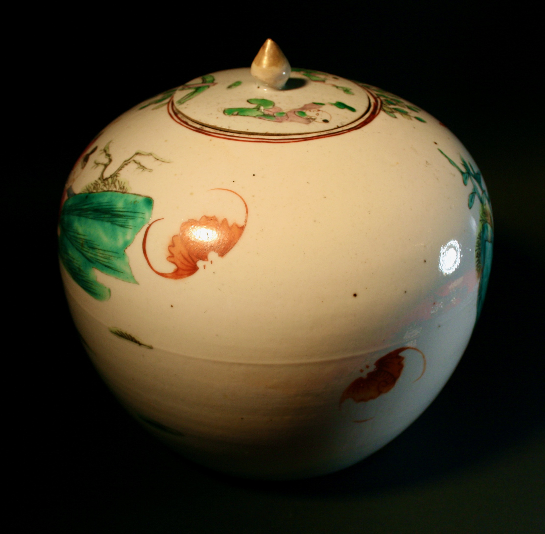 This is a stunning and remarkably aged original Chinese decorative glazed earthenware lidded jar, likely dating back to the late 18th to 19th century. It stands as an exquisite antique Chinese ceramic piece adorned with intricate hand-painted glazed outdoor garden landscape scenes of its time period. Within Chinese culture, these ceramic lidded jars traditionally found purpose in storing a diverse array of herbs and spices within the household. The artistry and craftsmanship showcased in these painted creations carried profound value for individuals who possess an affinity for the delicate beauty of ceramic pottery that graces their living spaces. Beyond its aesthetic allure, owning a piece such as this distinctive jar not only exuded opulence but also symbolized privilege, epitomizing the ability to possess such an exceptionally refined and remarkable artifact. Remarkably, this specific piece remains in fantastic condition given its age, as only a few examples of such pottery that was once an everyday staple have endured from this period. Approximately 8 inches in height and 9 inches in width, this jar preserves its original size, presenting a tangible connection to the past and showcasing the fine craftsmanship of its era.